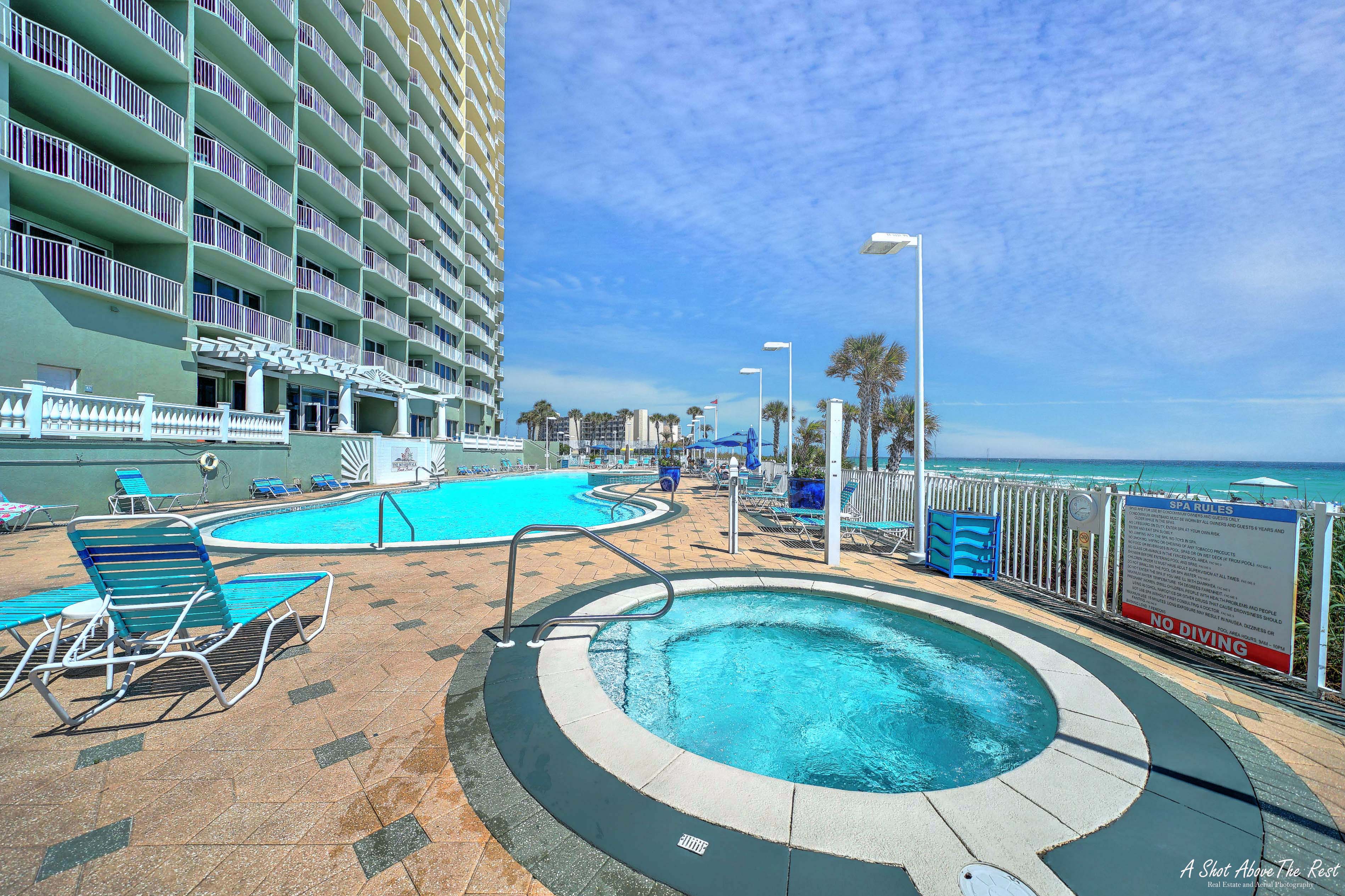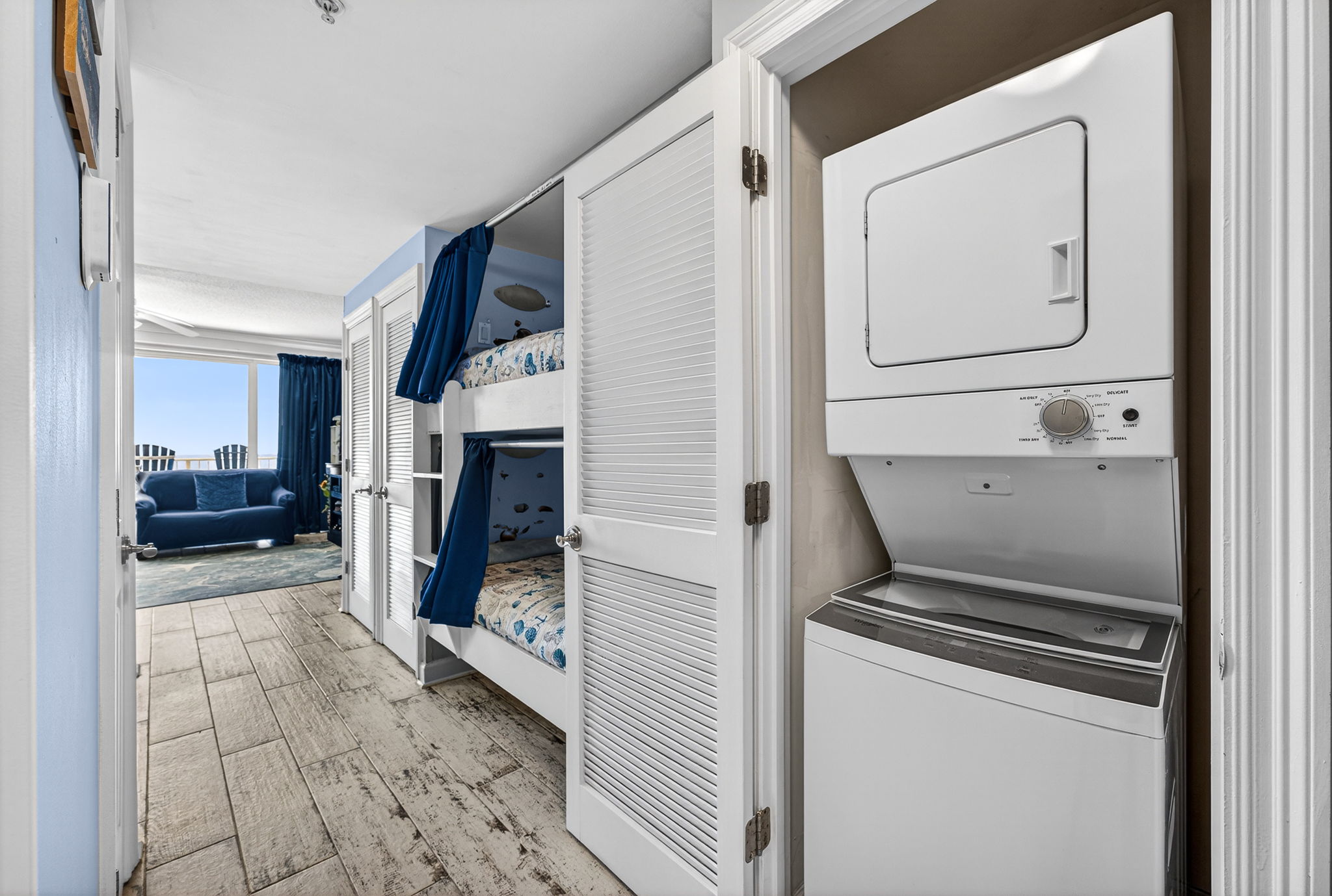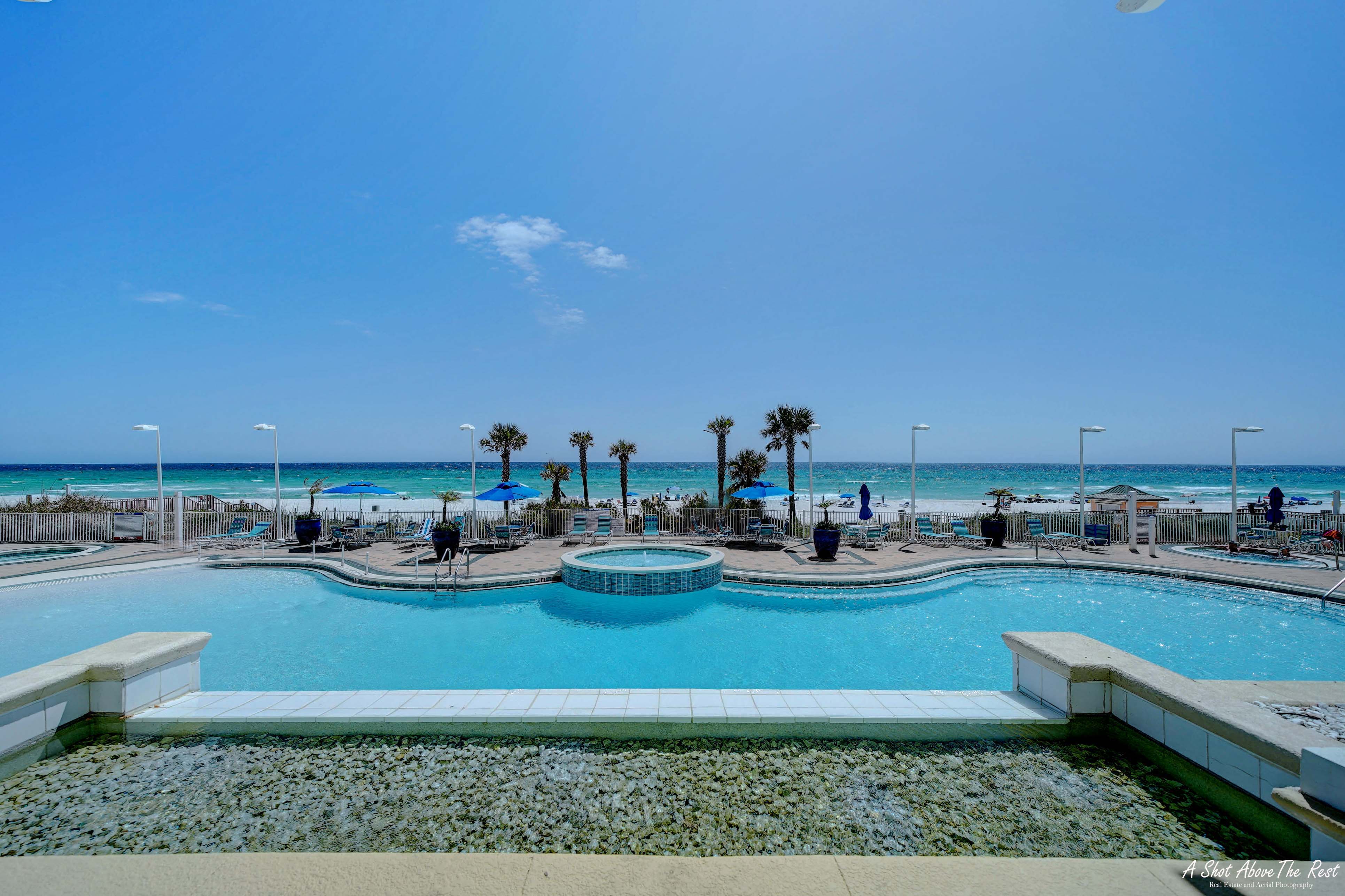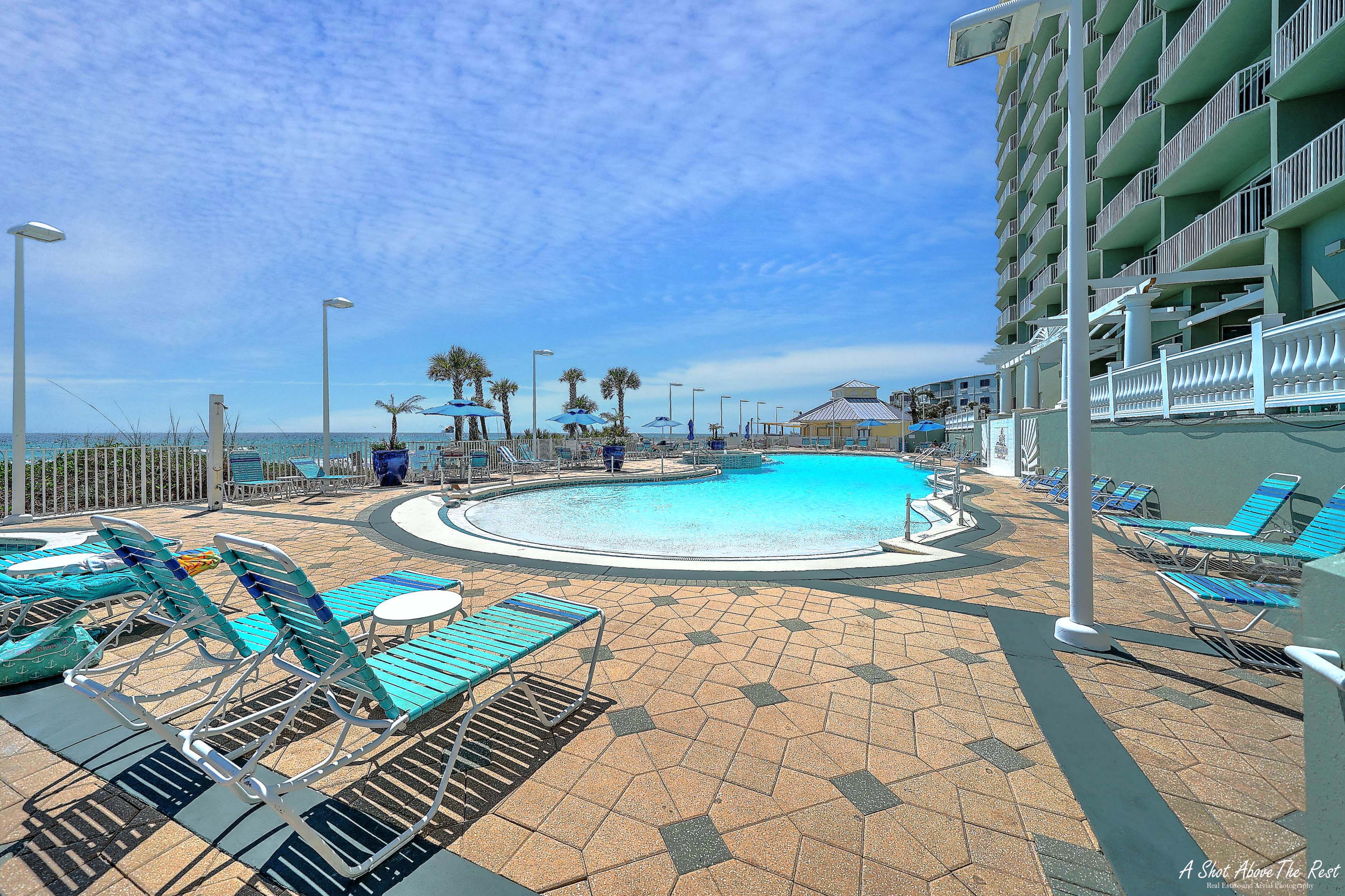 This unit offers almost 800 square feet of beachfront living space. The fully equipped kitchen features granite countertops and has everything you need to prepare meals for family and friends. The living room offers ample, comfortable seating with expansive views of the gulf, a large television, and access to the unit's private balcony, where you can enjoy a cup of coffee or a cocktail while overlooking the beach. The master bedroom has a King size bed and television, and the bathroom has a beautifully tiled, walk-in shower. There is also a bonus bunk nook, twin over twin, perfect for families traveling with children, as well as a pullout sofa, allowing the unit to comfortably sleep 6. For your convenience, there is a washing machine and dryer inside the unit for your use.