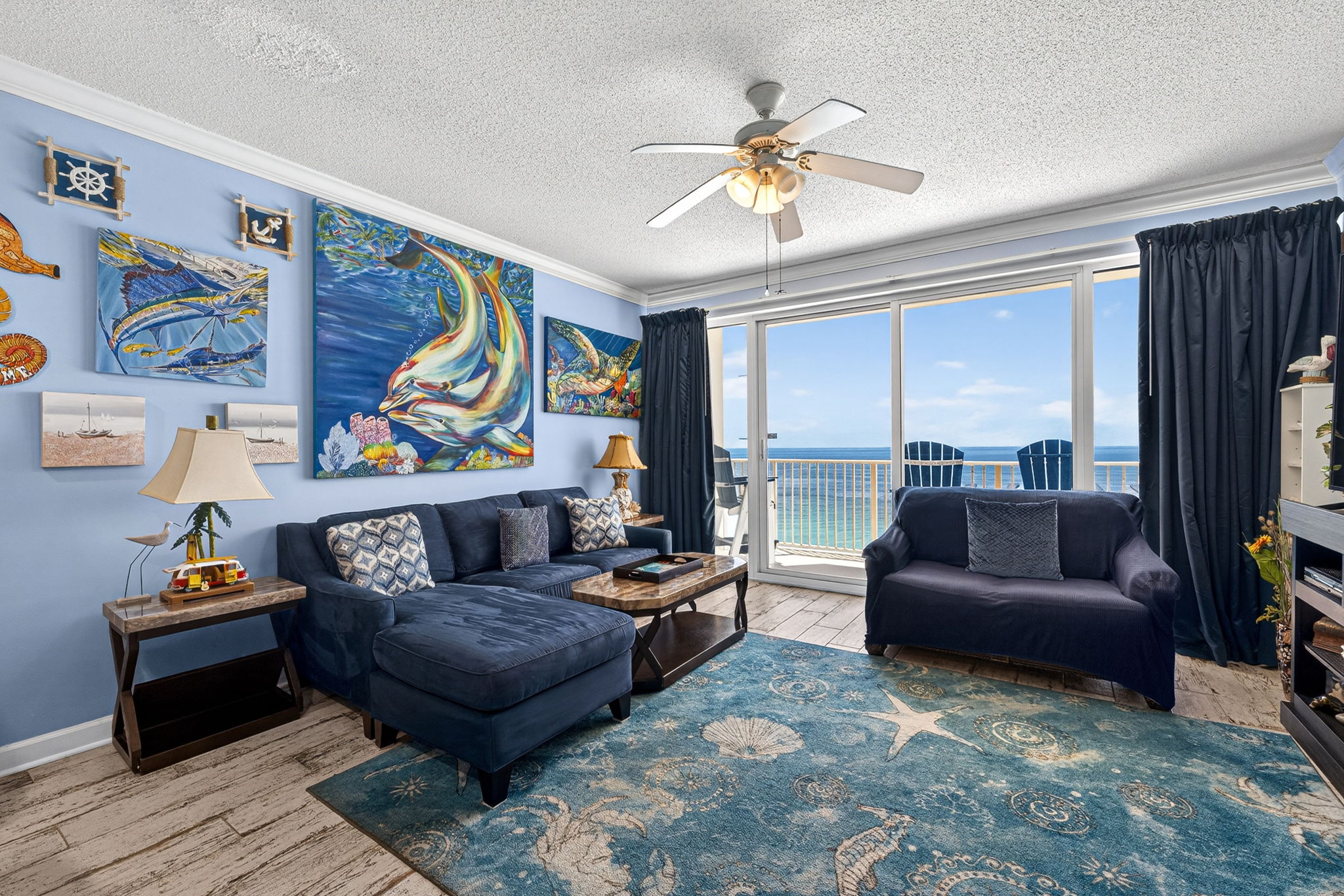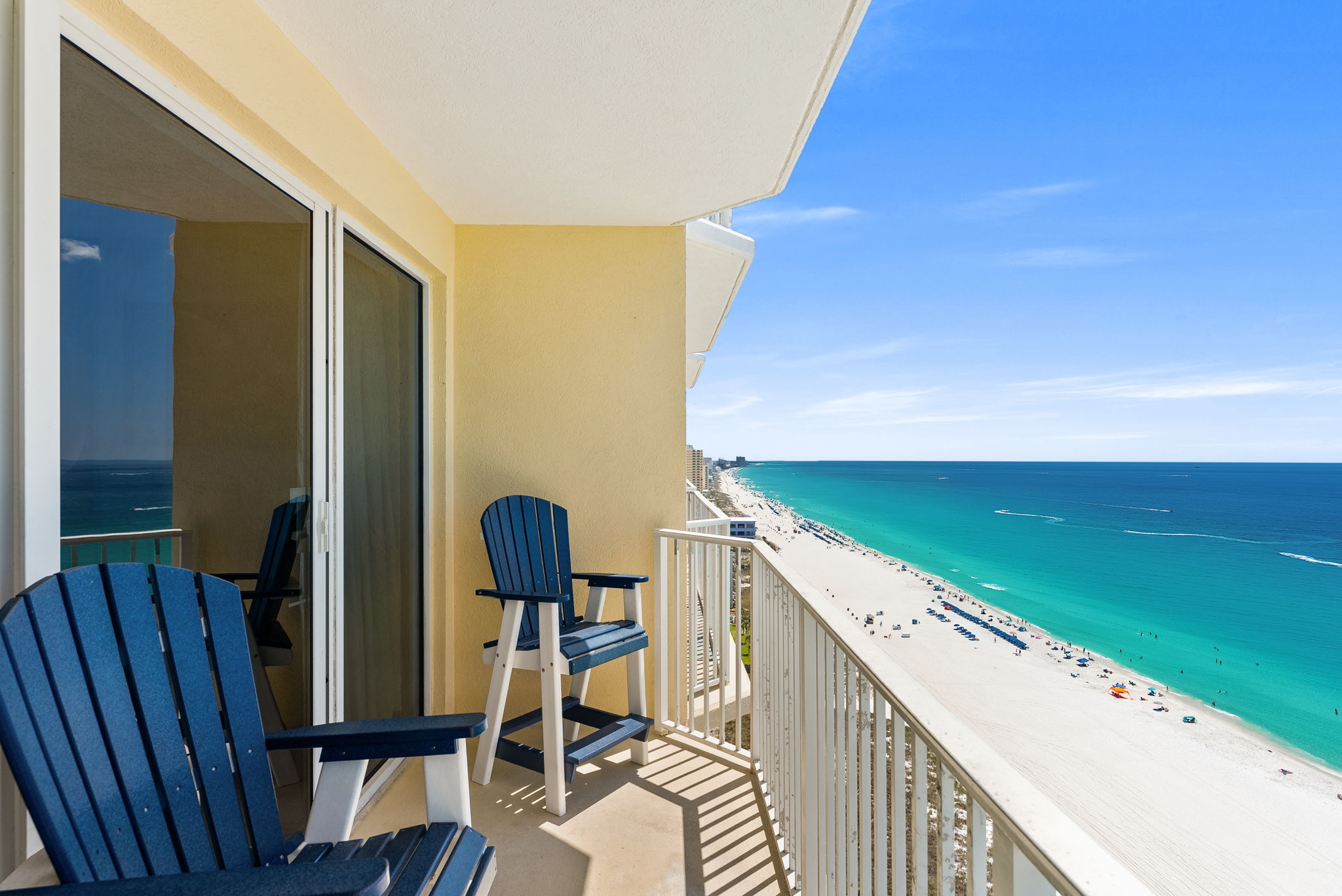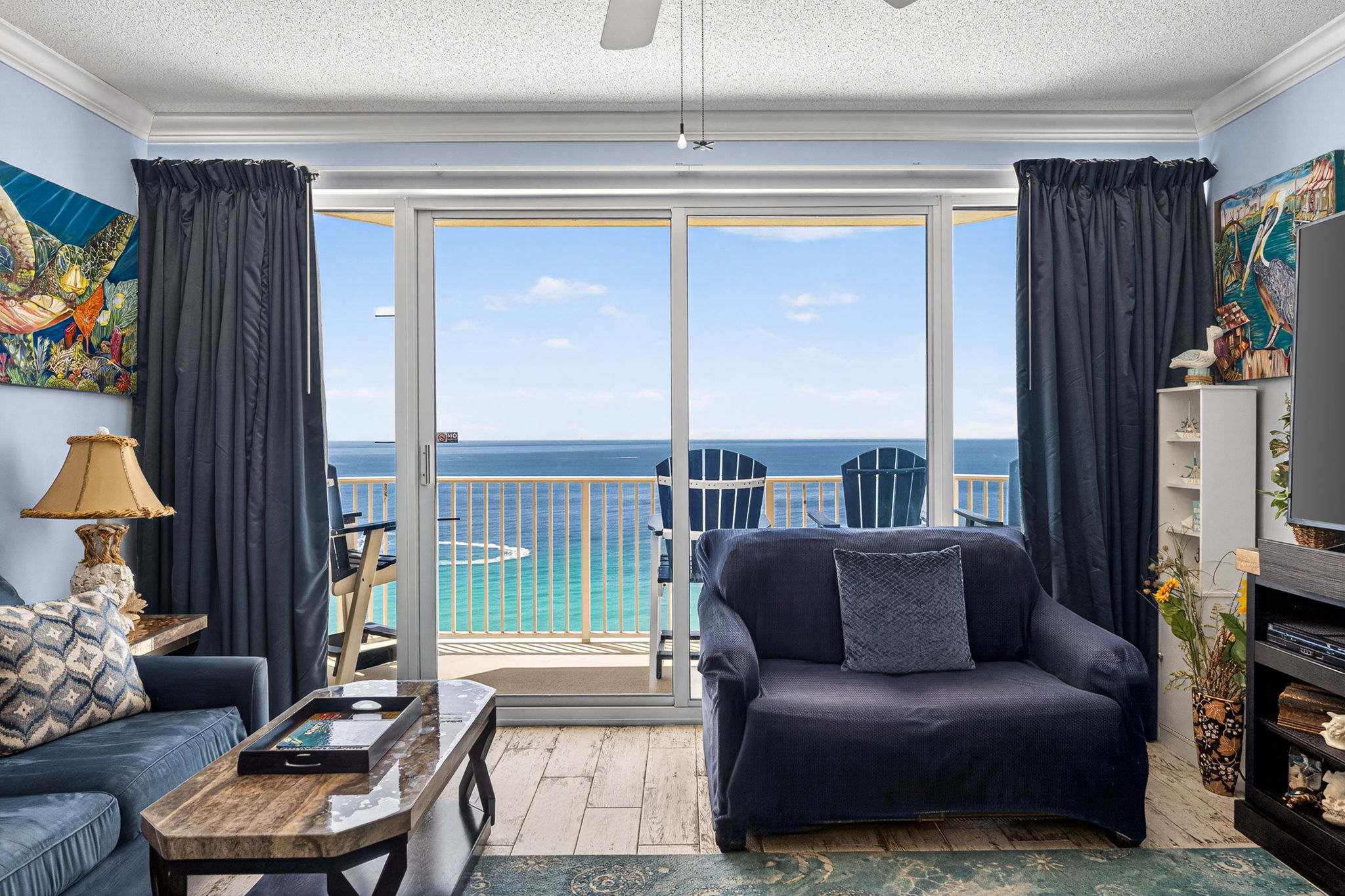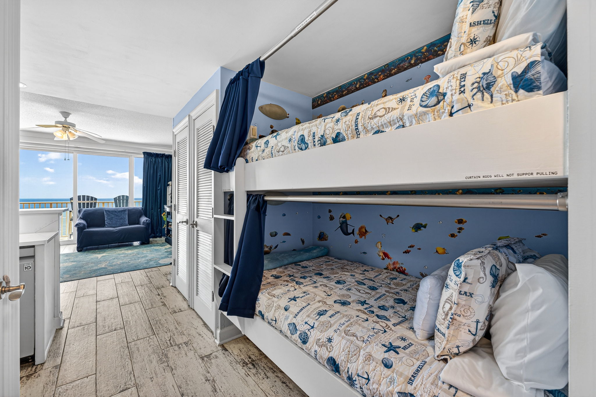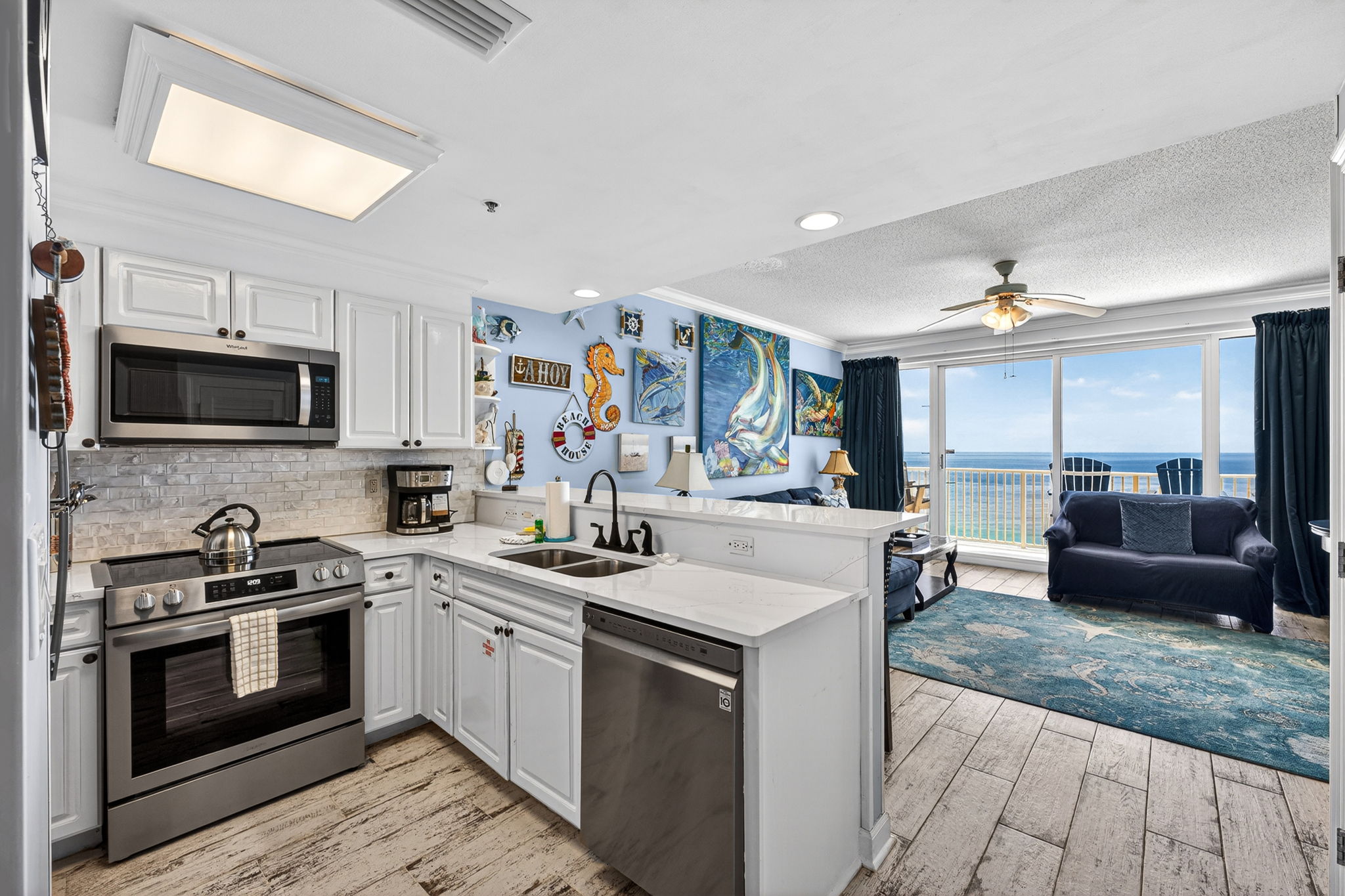 This unit offers almost 800 square feet of beachfront living space. The fully equipped kitchen features granite countertops and has everything you need to prepare meals for family and friends. The living room offers ample, comfortable seating with expansive views of the gulf, a large television, and access to the unit's private balcony, where you can enjoy a cup of coffee or a cocktail while overlooking the beach. The master bedroom has a King size bed and television, and the bathroom has a beautifully tiled, walk-in shower. There is also a bonus bunk nook, twin over twin, perfect for families traveling with children, as well as a pullout sofa, allowing the unit to comfortably sleep 6. For your convenience, there is a washing machine and dryer inside the unit for your use.