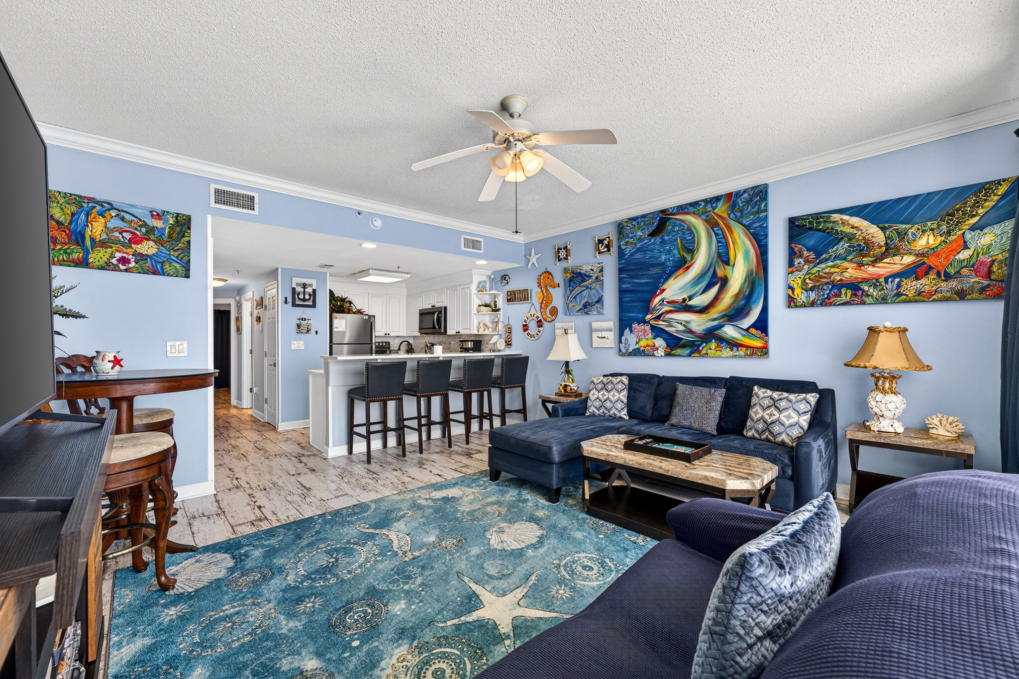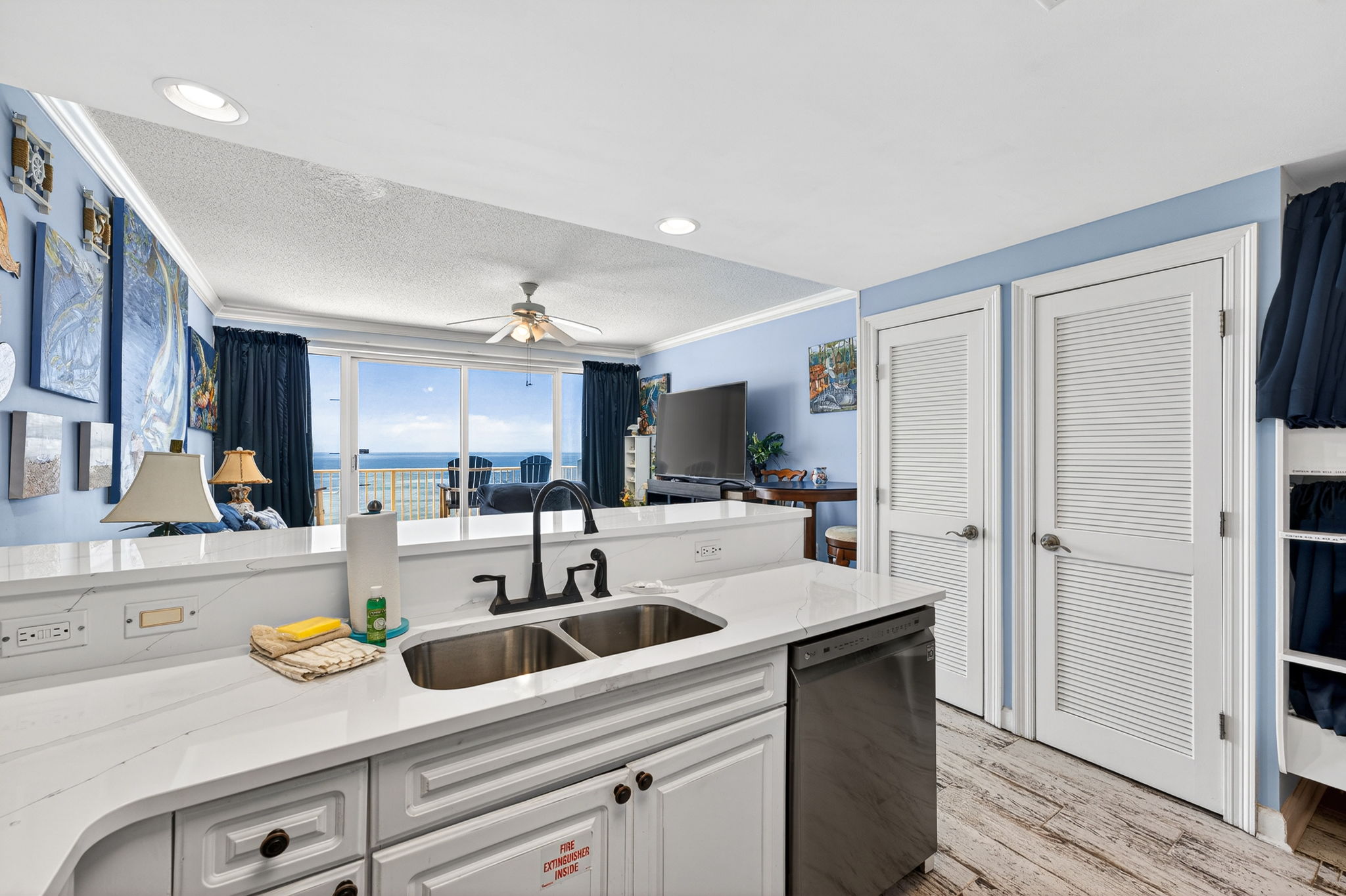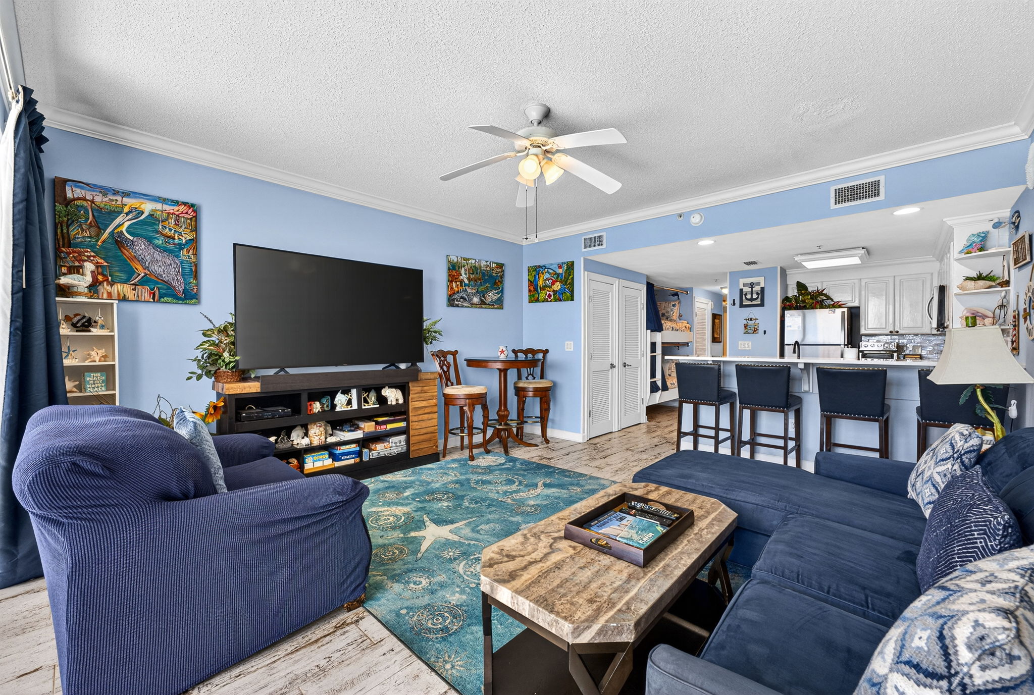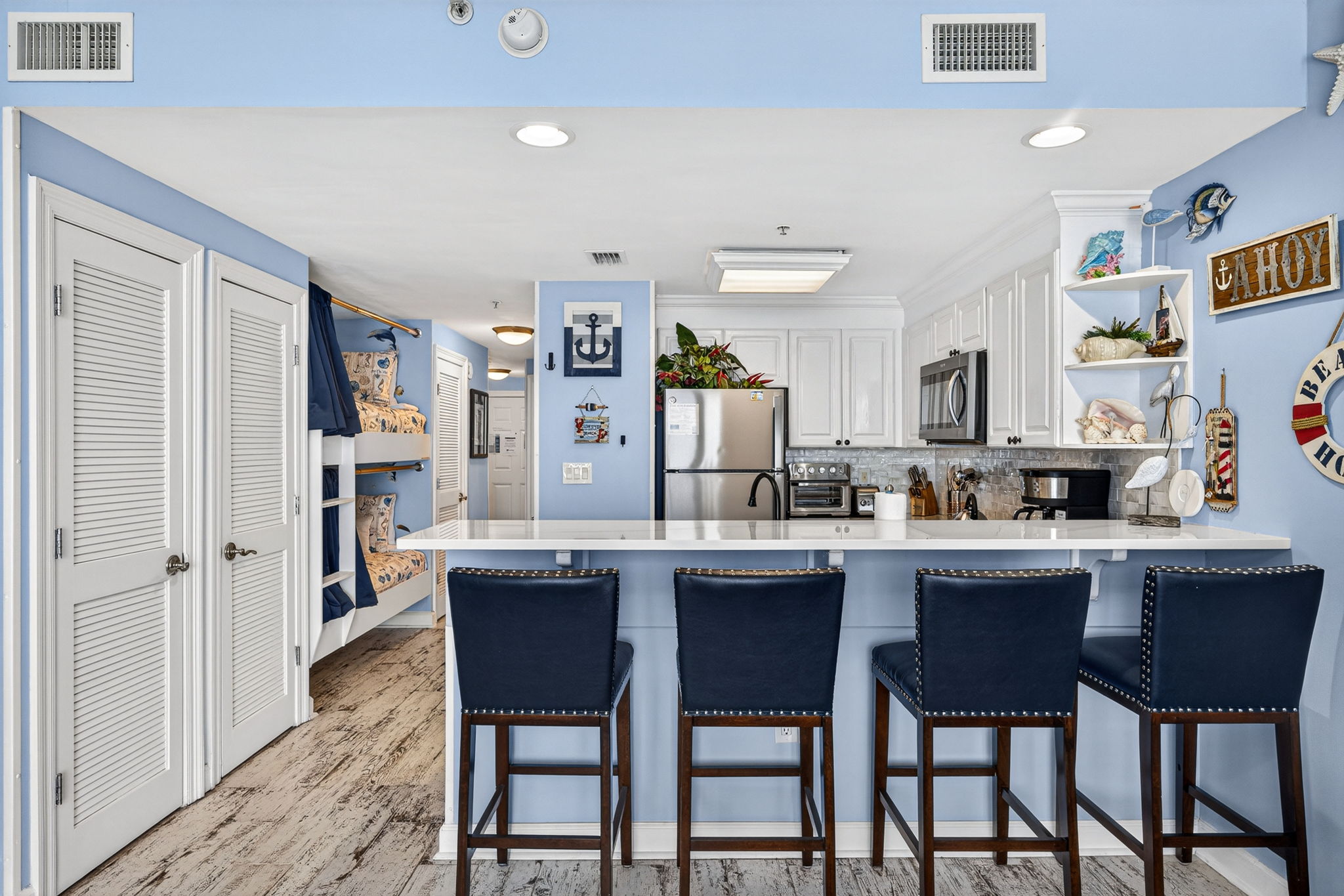 This unit offers almost 800 square feet of beachfront living space. The fully equipped kitchen features granite countertops and has everything you need to prepare meals for family and friends. The living room offers ample, comfortable seating with expansive views of the gulf, a large television, and access to the unit's private balcony, where you can enjoy a cup of coffee or a cocktail while overlooking the beach. The master bedroom has a King size bed and television, and the bathroom has a beautifully tiled, walk-in shower. There is also a bonus bunk nook, twin over twin, perfect for families traveling with children, as well as a pullout sofa, allowing the unit to comfortably sleep 6. For your convenience, there is a washing machine and dryer inside the unit for your use.