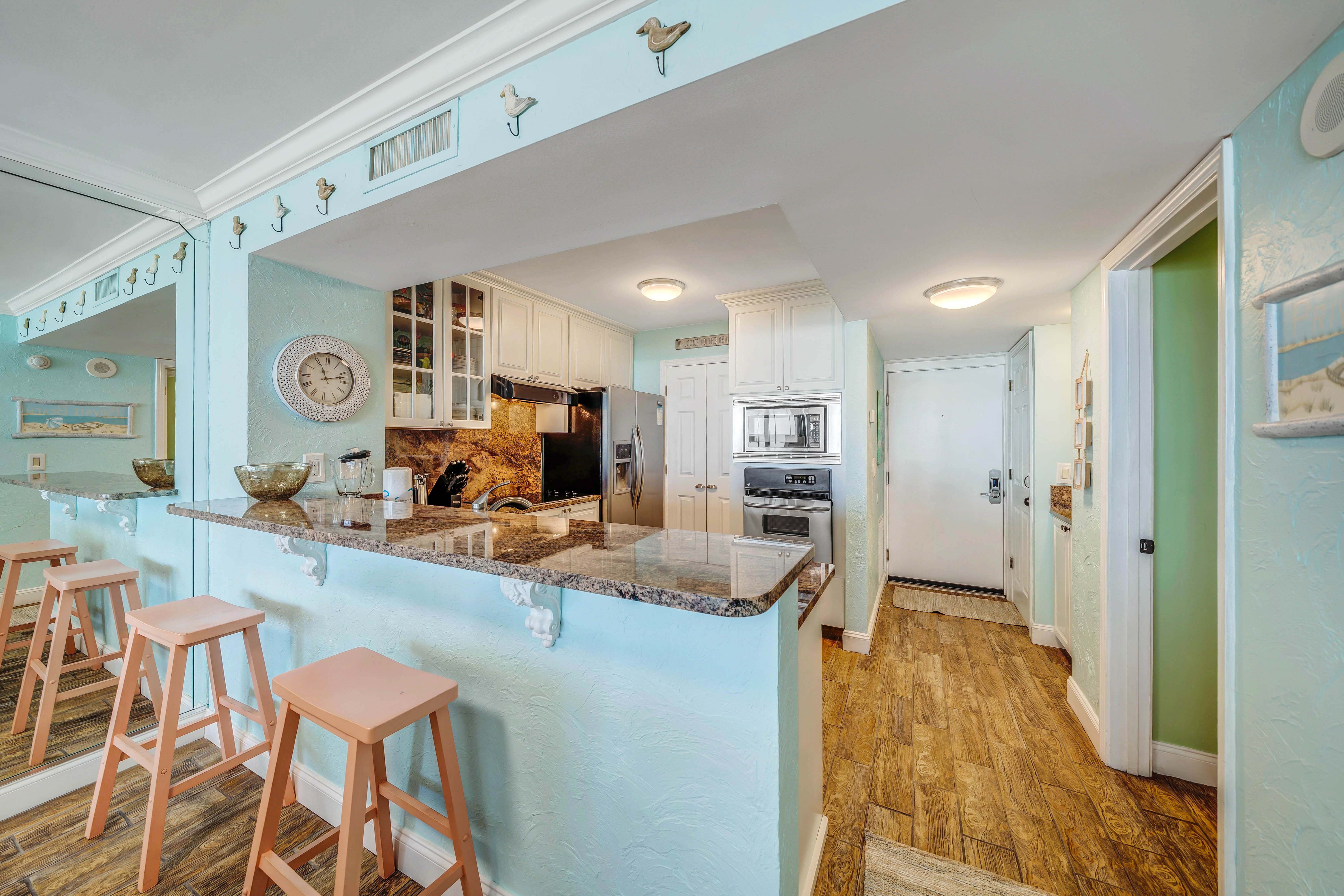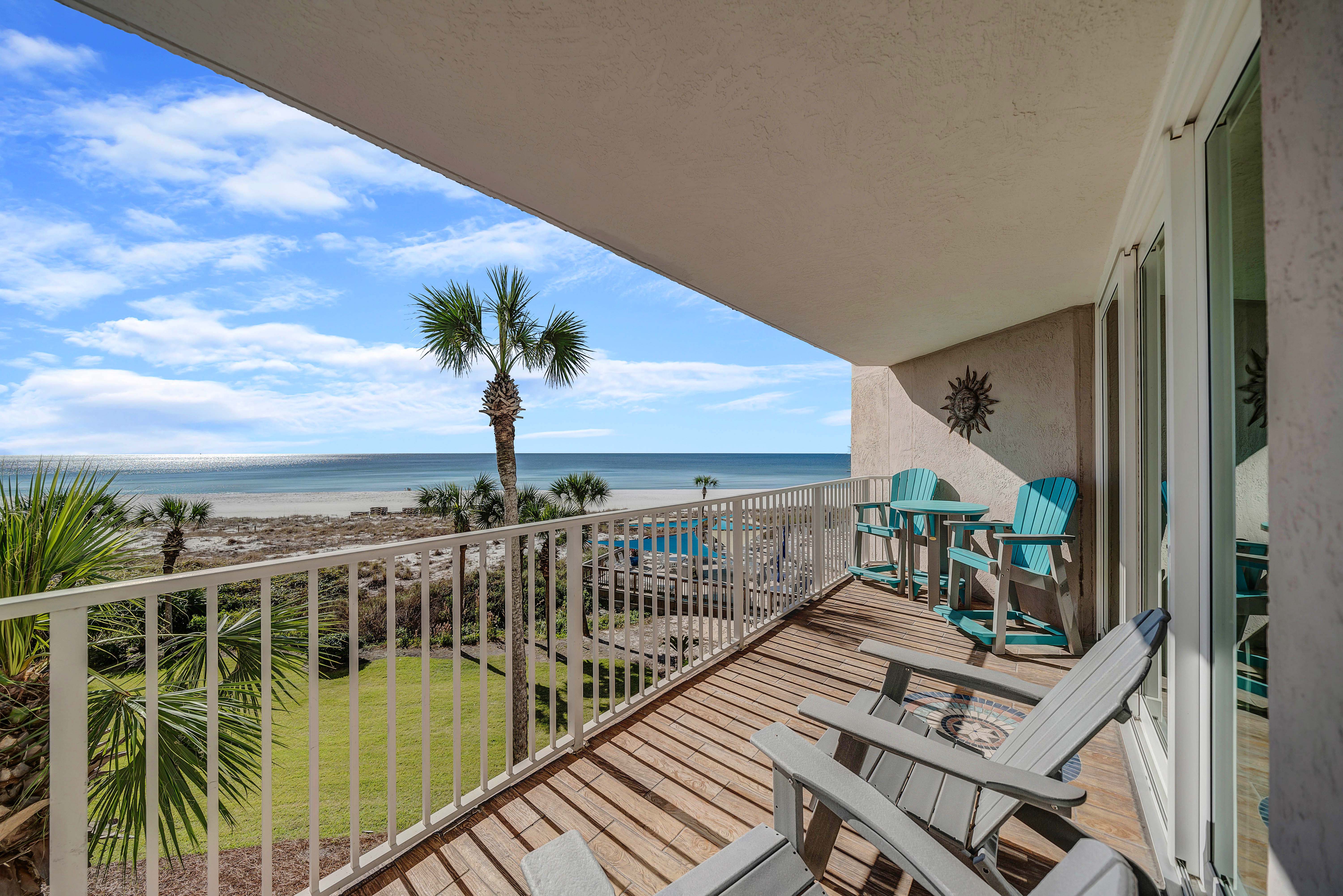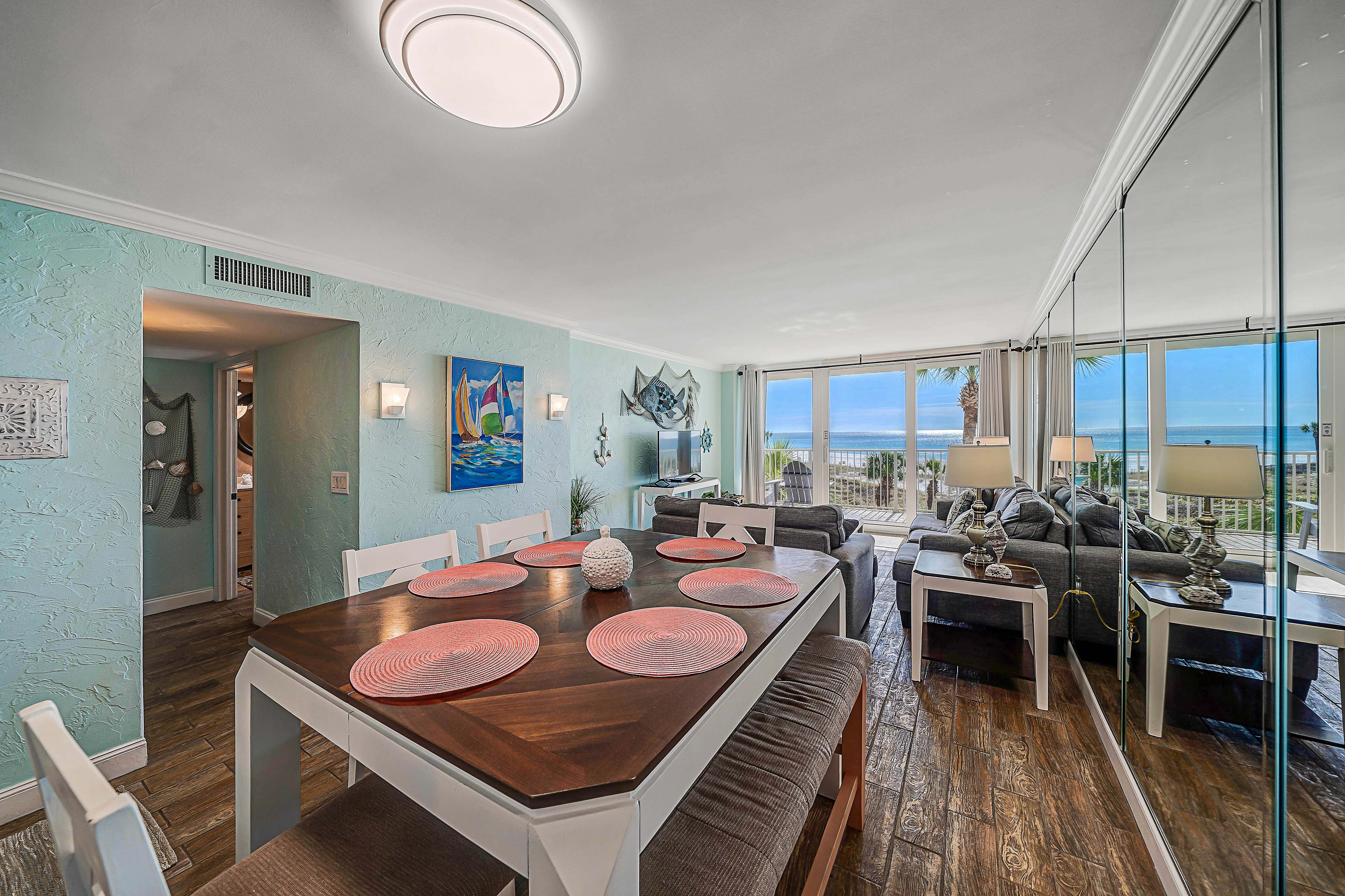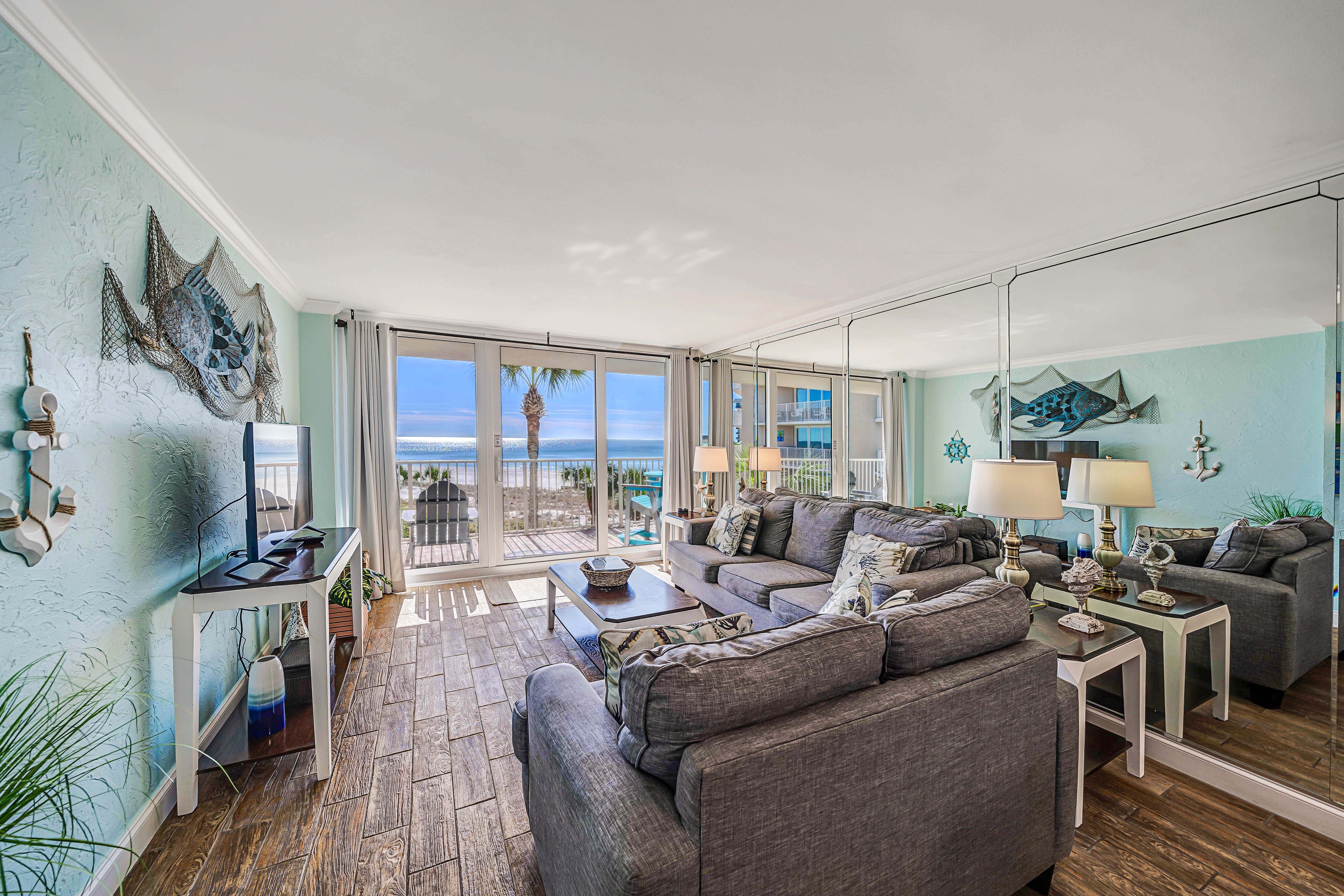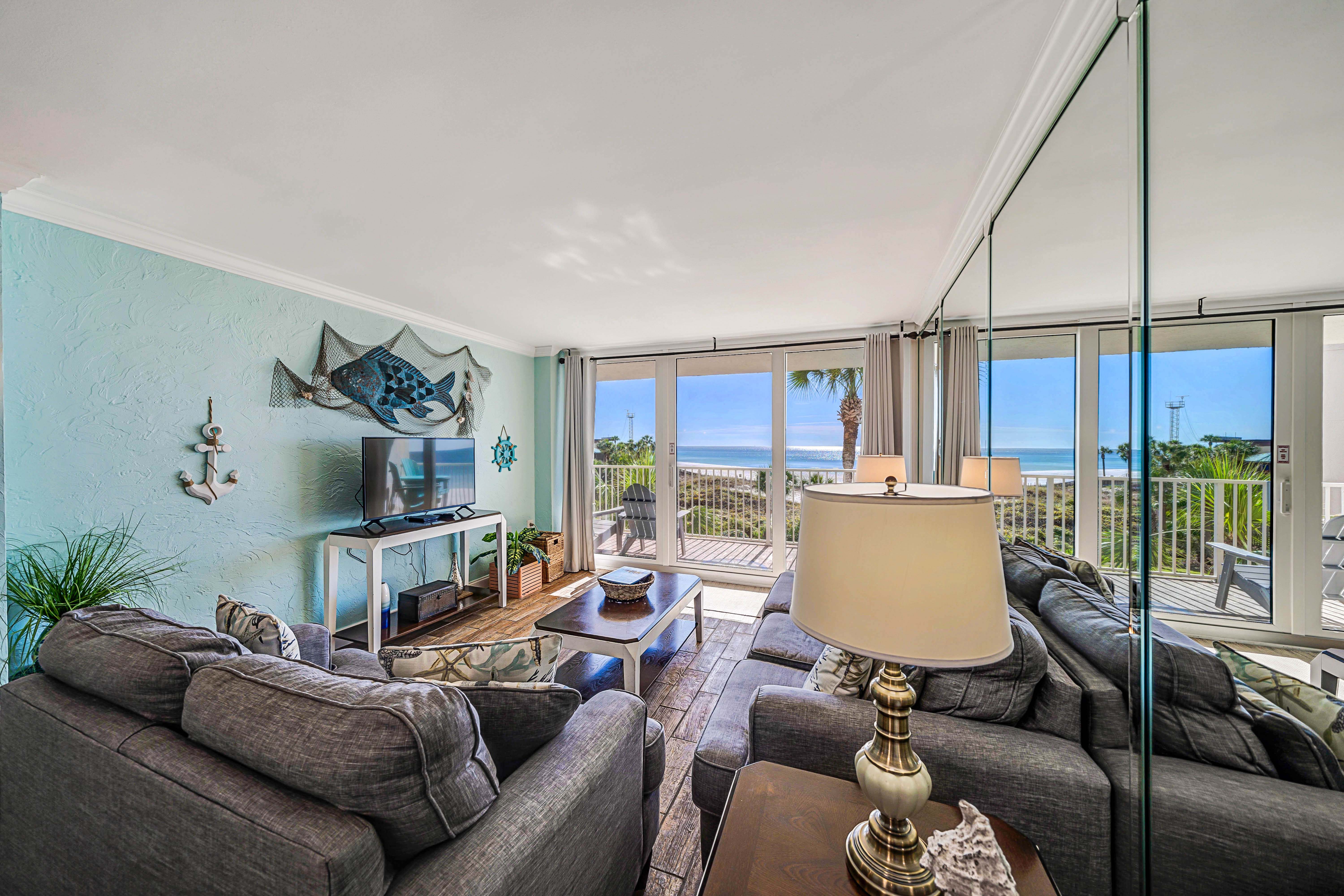 This unit offers 1,000 square feet of beachfront living space. The fully equipped kitchen features granite countertops, stainless-steel appliances, and has everything you need to prepare meals for family & friends. The living room offers ample, comfortable seating with views of the gulf, a Smart television w/DirectTV, and access to the unit's private balcony. The master bedroom offers a King size bed, Smart television w/DirectTV, and ensuite bathroom with a tub/shower combo. The second bedroom has both a full-size bed, as well as a twin, and its own Smart TV w/Direct TV, and the second full bathroom offers a walk-in shower. Additionally, the living room sofa pulls out into a Queen size bed, allowing the unit to comfortably sleep 7. For your convenience, there is a washing machine and dryer inside the unit for your use.