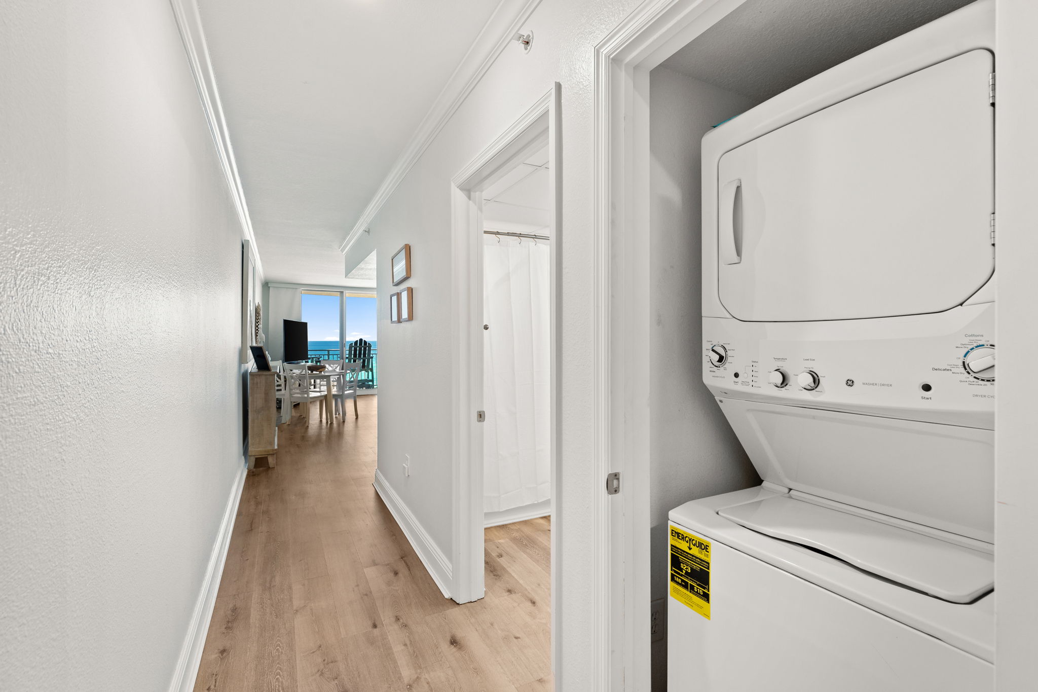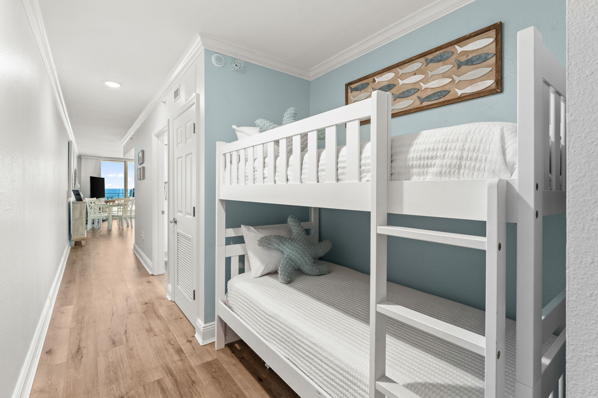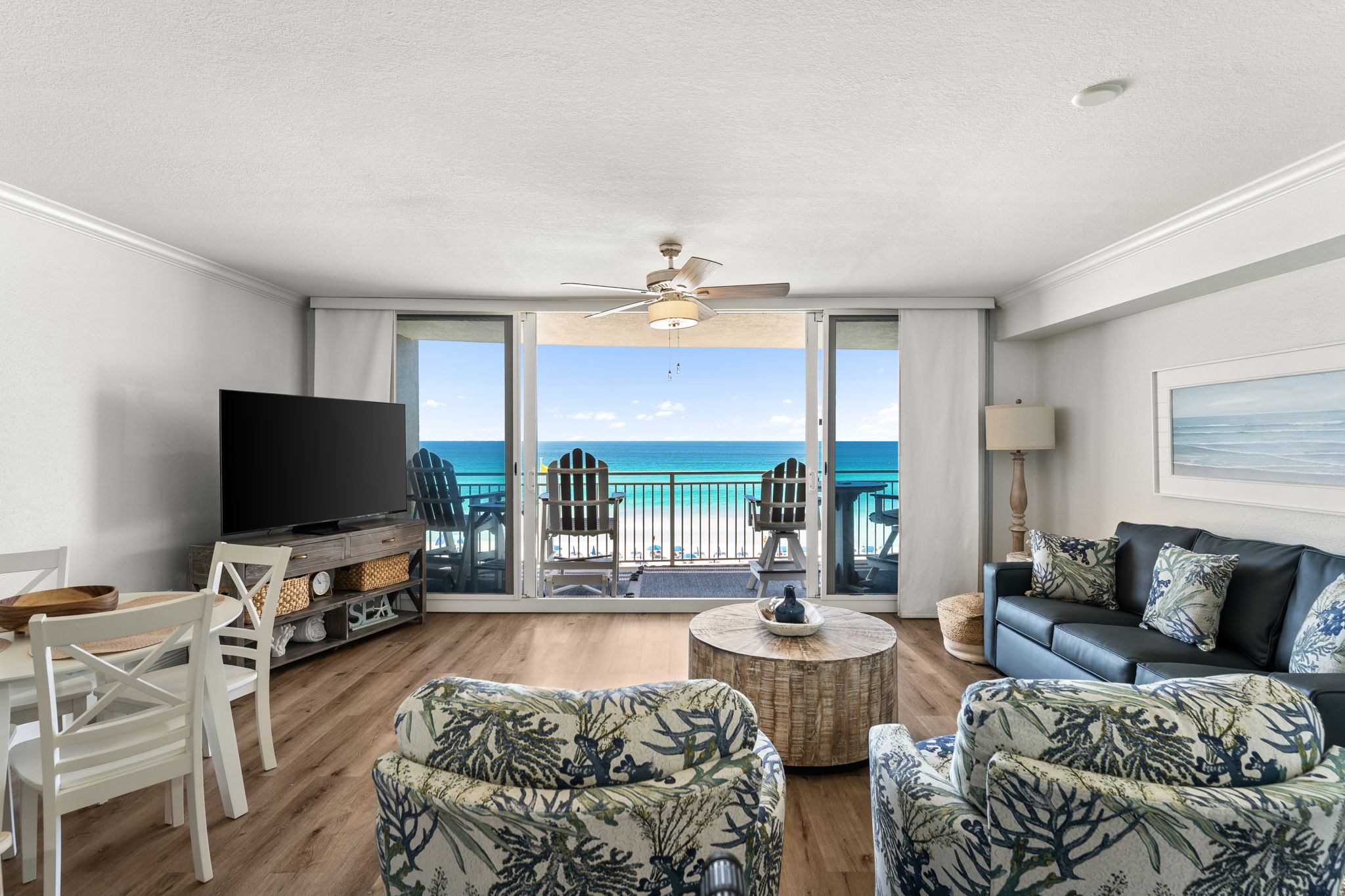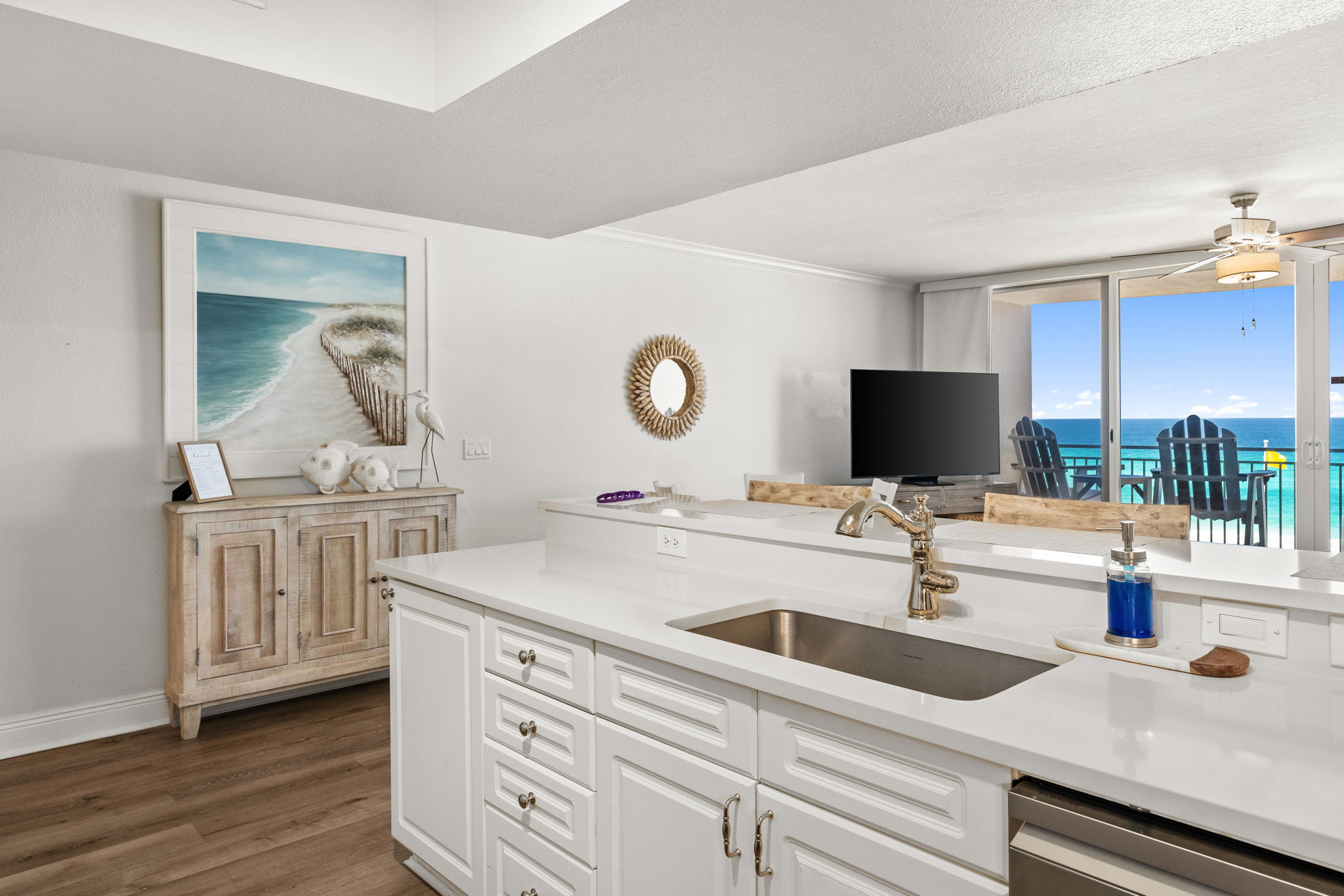 This updated 4th floor beachfront condo offers almost 1,000 square feet of coastal living space. The fully equipped kitchen features quartz countertops, stainless-steel appliances, and everything you need to prepare meals for family & friends. There is a dining table, perfect for enjoying a meal or playing a game, as well as additional breakfast bar seating. The living room offers ample, comfortable seating, a large television, and incredible gulf views. The master bedroom offers a King size bed, television, and its own ensuite bathroom with a beautifully tiled tub/shower combo. There is a bunk area, perfect for traveling with children, as well as a second full bathroom. The living room sofa also pulls out into a bed, allowing the unit to comfortably sleep 6. For your convenience, there is also a washing machine and dryer inside the unit for your use.