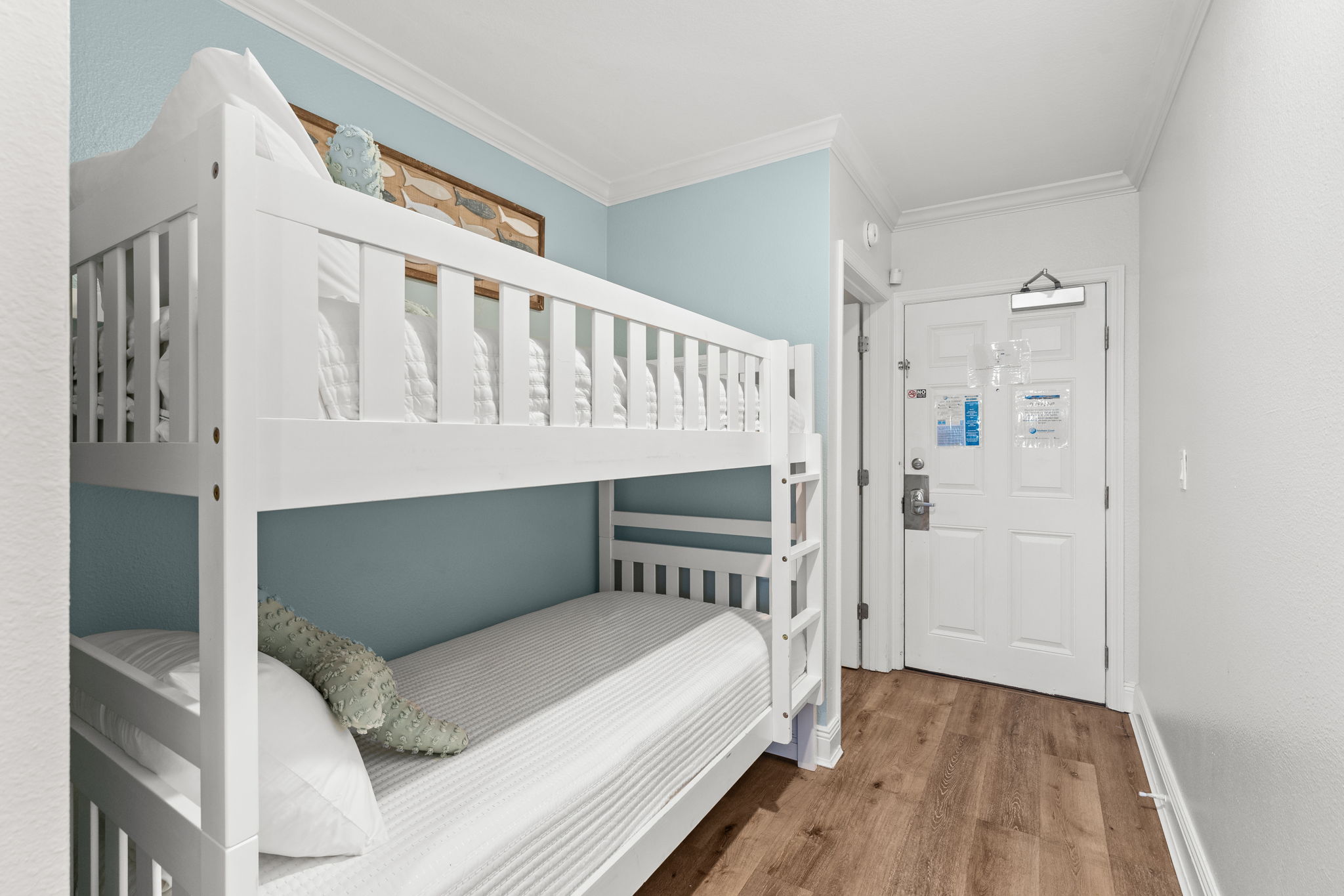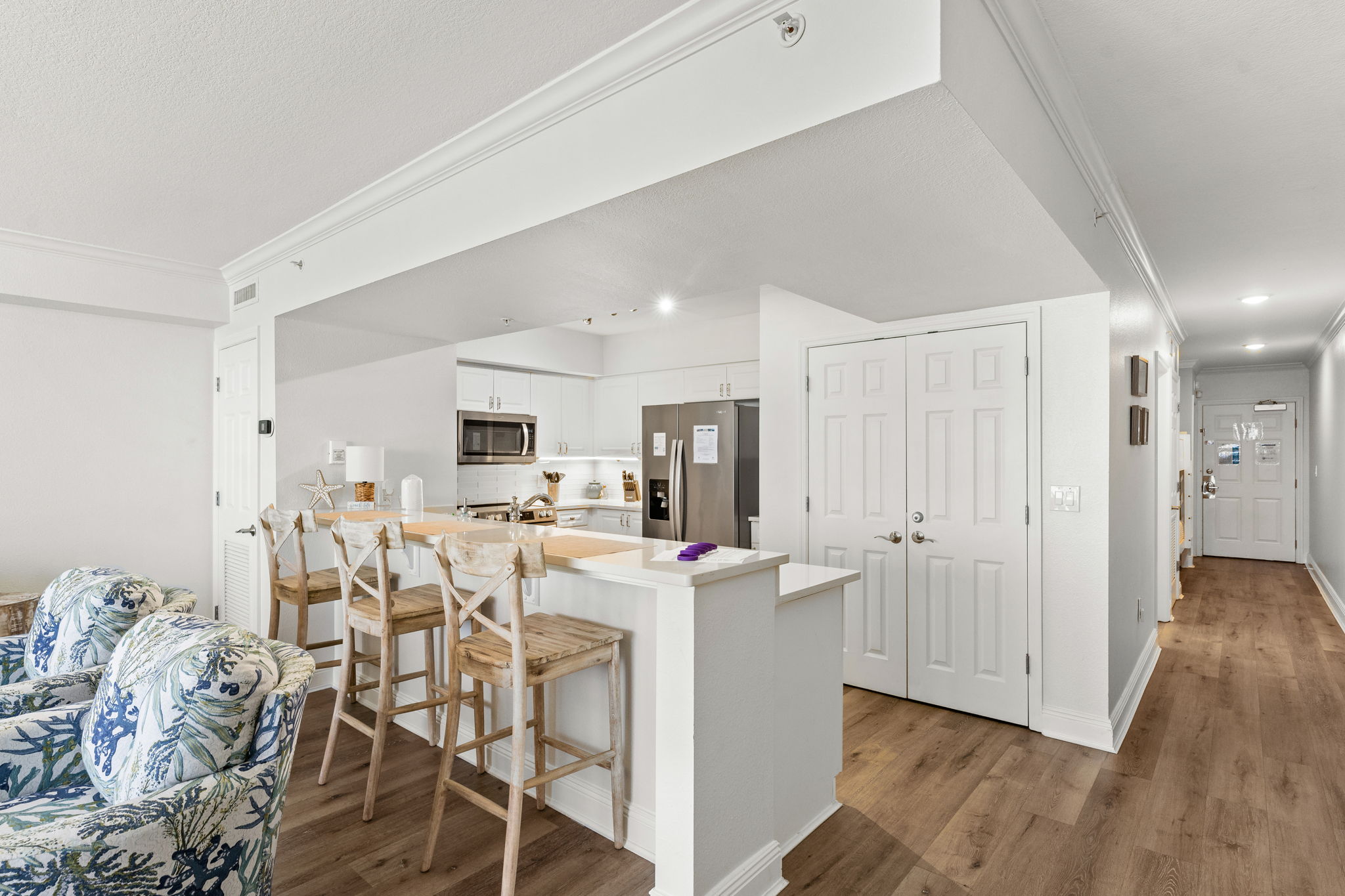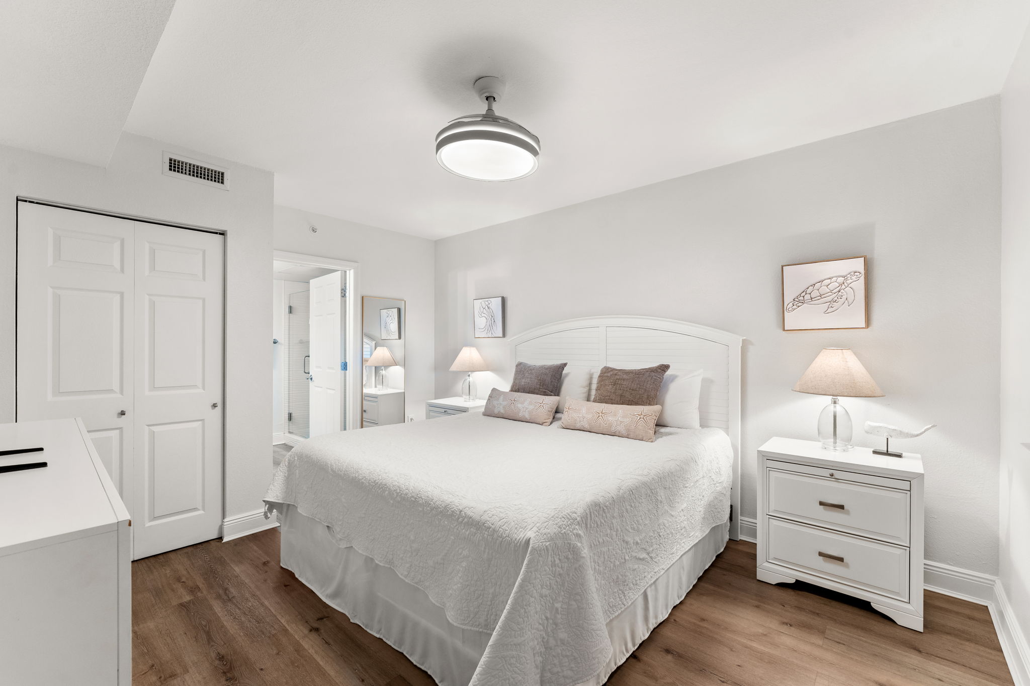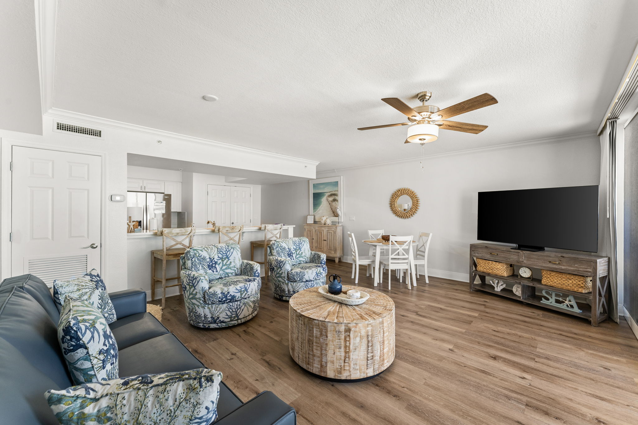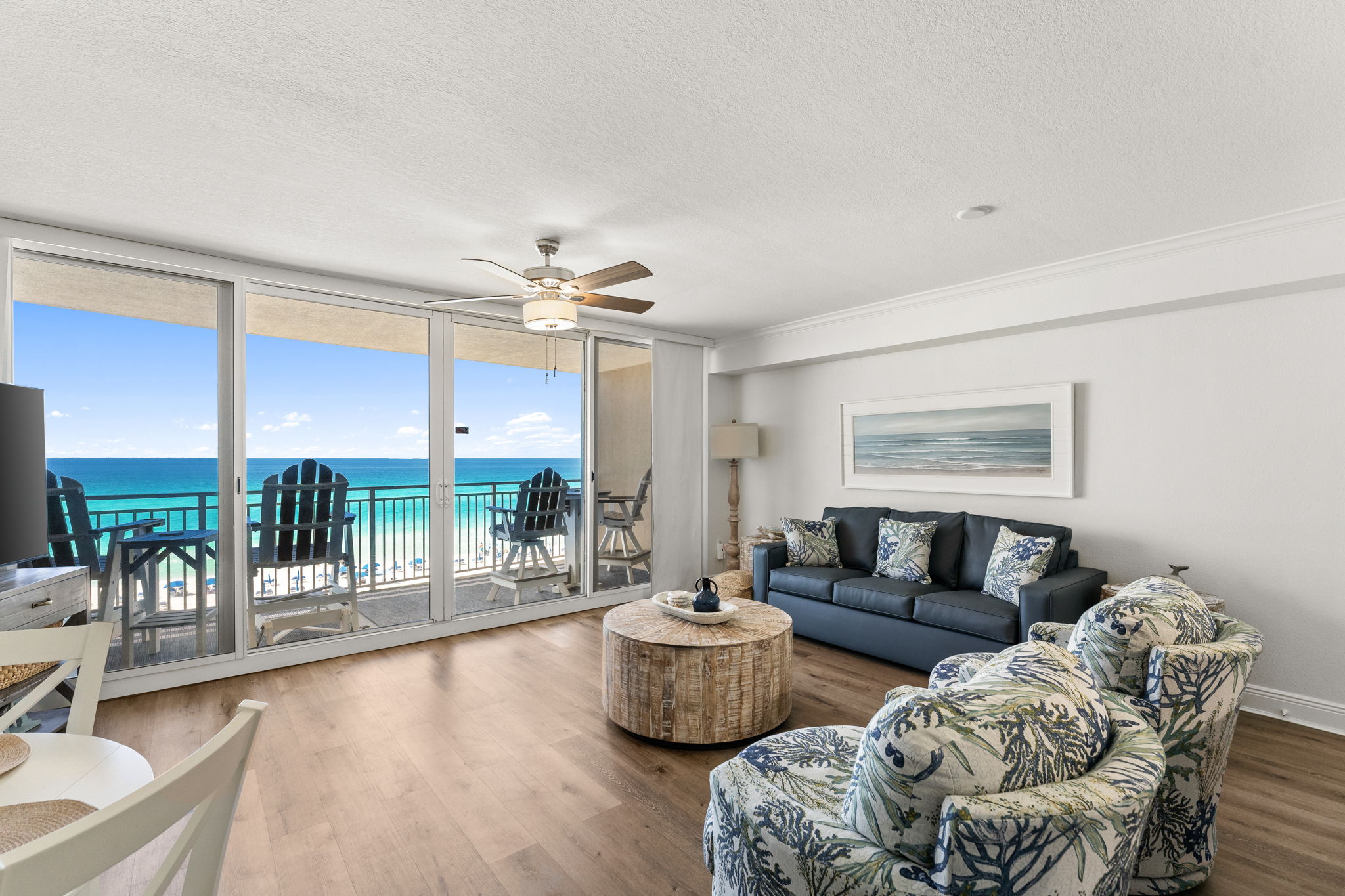This updated 4th floor beachfront condo offers almost 1,000 square feet of coastal living space. The fully equipped kitchen features quartz countertops, stainless-steel appliances, and everything you need to prepare meals for family & friends. There is a dining table, perfect for enjoying a meal or playing a game, as well as additional breakfast bar seating. The living room offers ample, comfortable seating, a large television, and incredible gulf views. The master bedroom offers a King size bed, television, and its own ensuite bathroom with a beautifully tiled tub/shower combo. There is a bunk area, perfect for traveling with children, as well as a second full bathroom. The living room sofa also pulls out into a bed, allowing the unit to comfortably sleep 6. For your convenience, there is also a washing machine and dryer inside the unit for your use.
