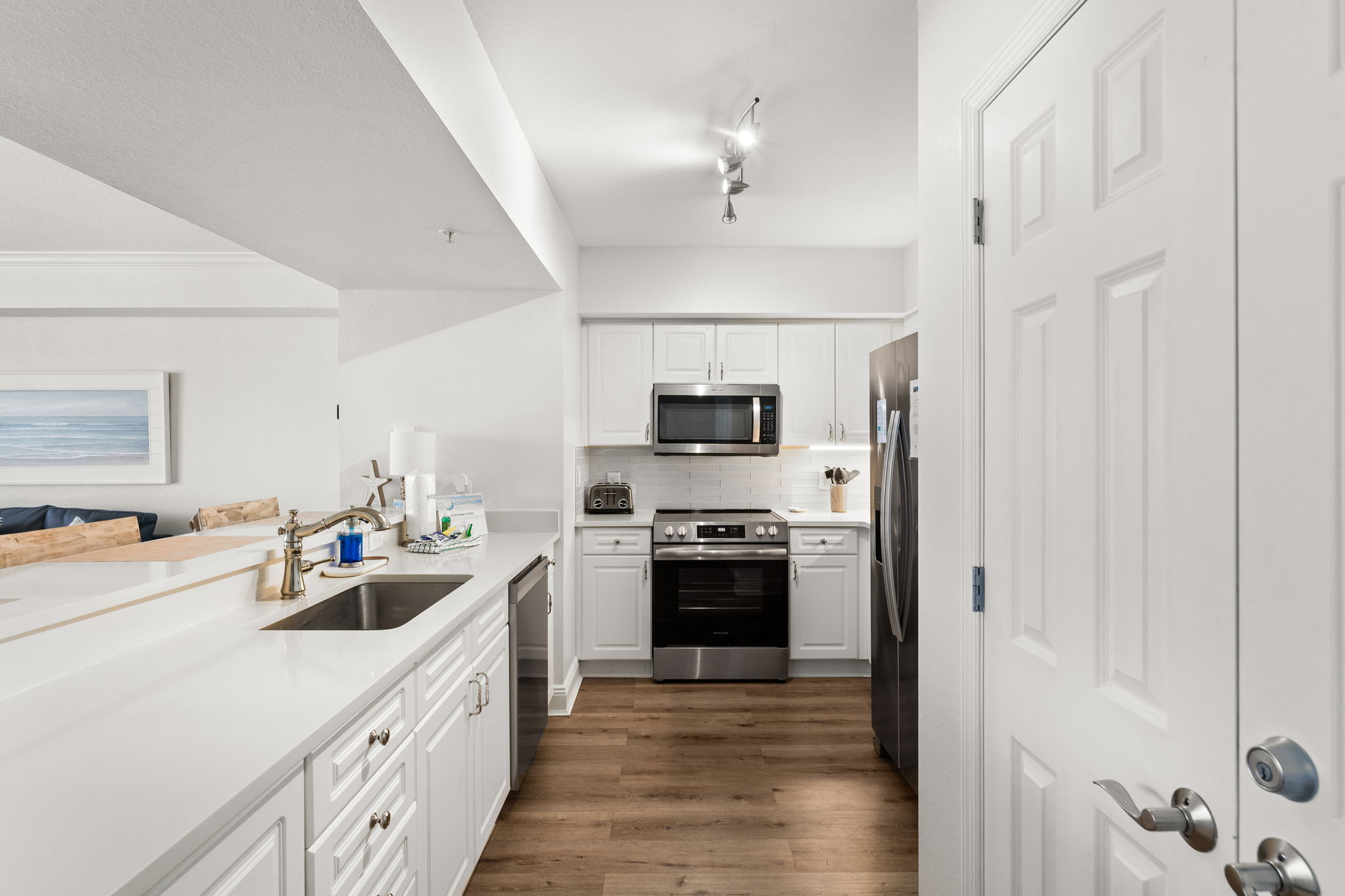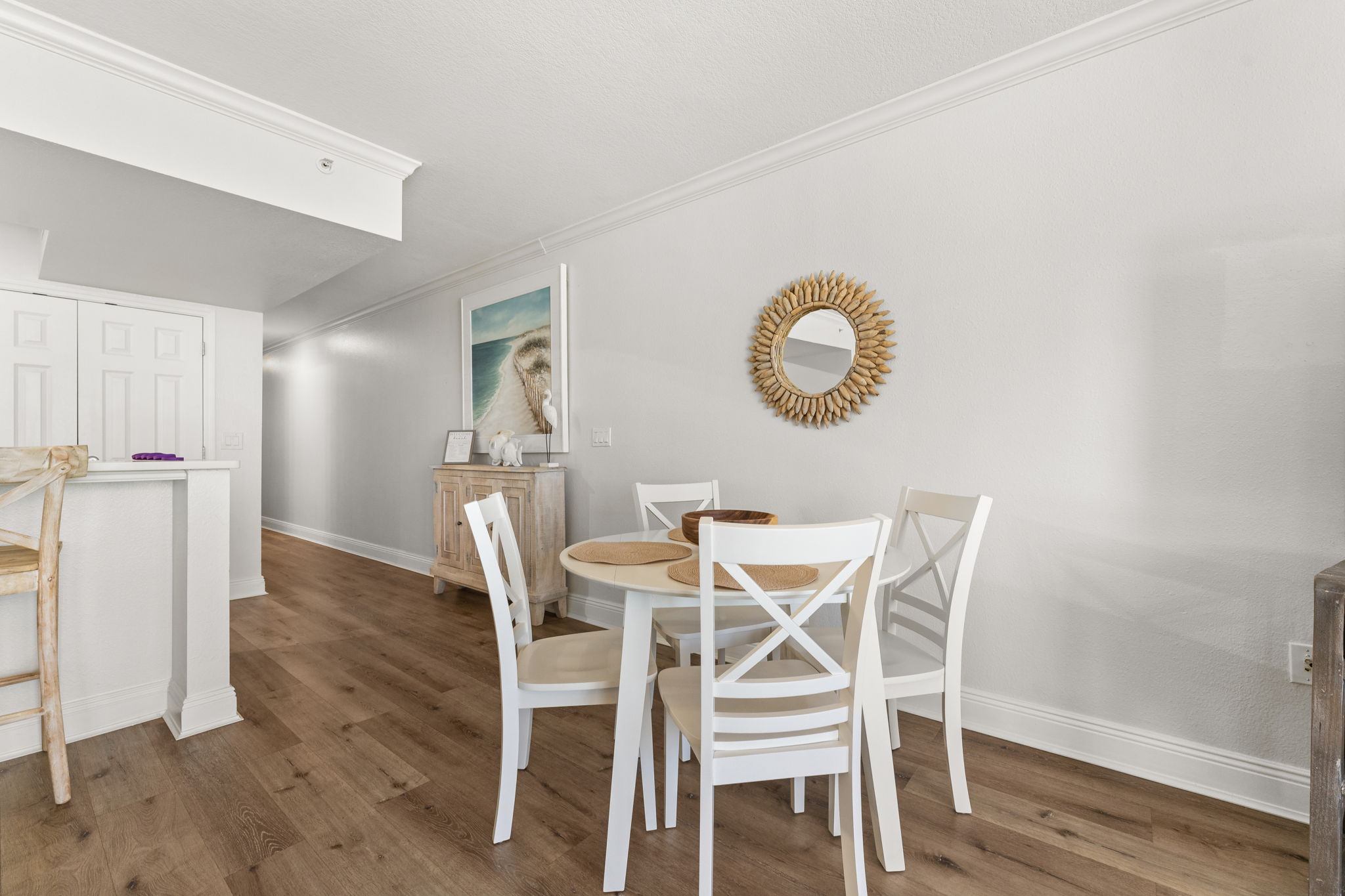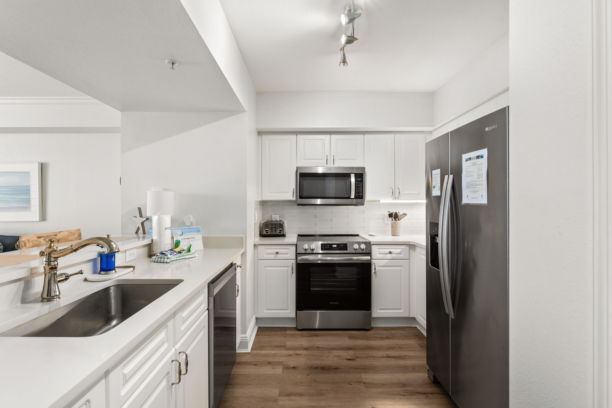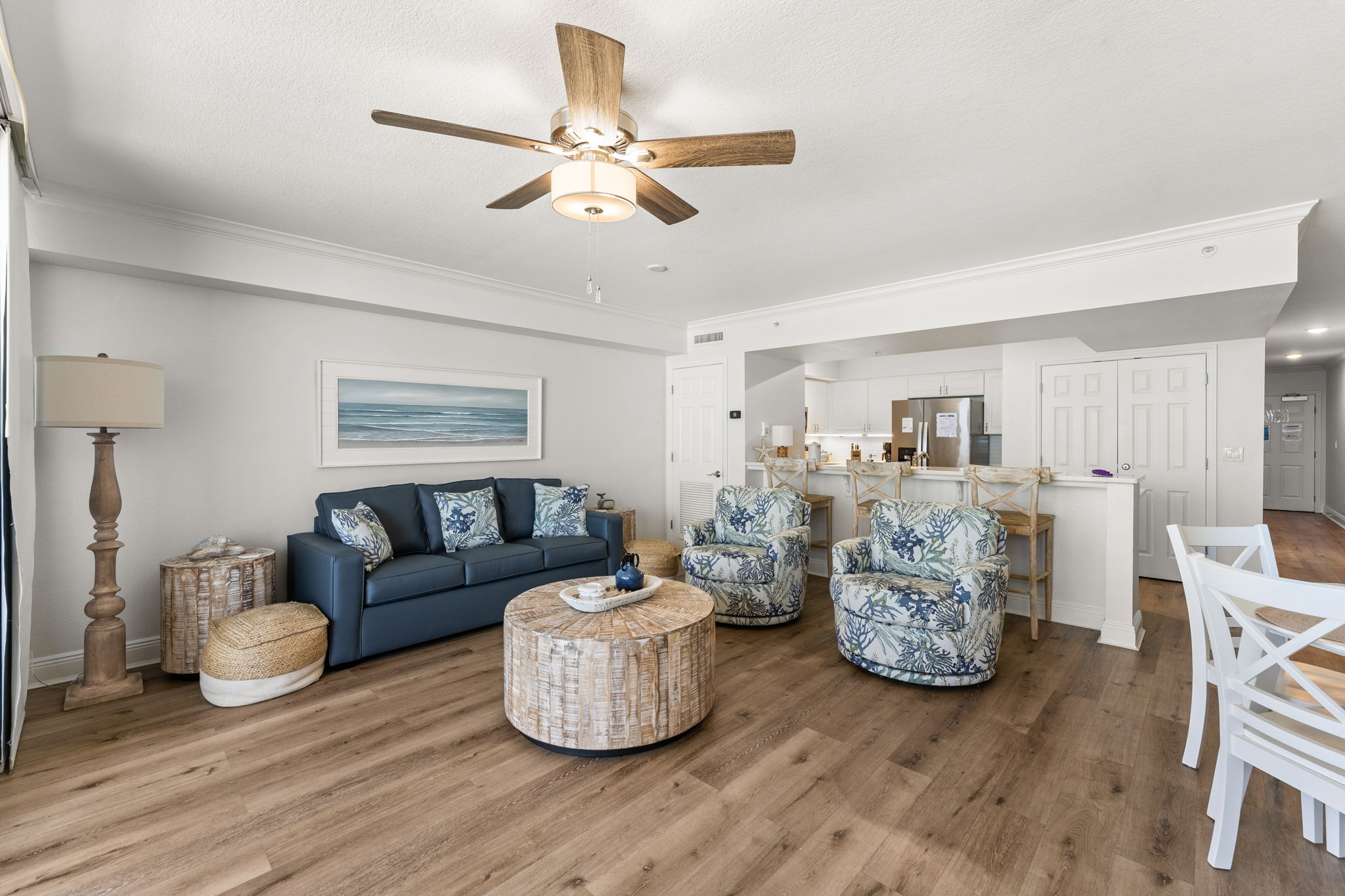 This updated 4th floor beachfront condo offers almost 1,000 square feet of coastal living space. The fully equipped kitchen features quartz countertops, stainless-steel appliances, and everything you need to prepare meals for family & friends. There is a dining table, perfect for enjoying a meal or playing a game, as well as additional breakfast bar seating. The living room offers ample, comfortable seating, a large television, and incredible gulf views. The master bedroom offers a King size bed, television, and its own ensuite bathroom with a beautifully tiled tub/shower combo. There is a bunk area, perfect for traveling with children, as well as a second full bathroom. The living room sofa also pulls out into a bed, allowing the unit to comfortably sleep 6. For your convenience, there is also a washing machine and dryer inside the unit for your use.