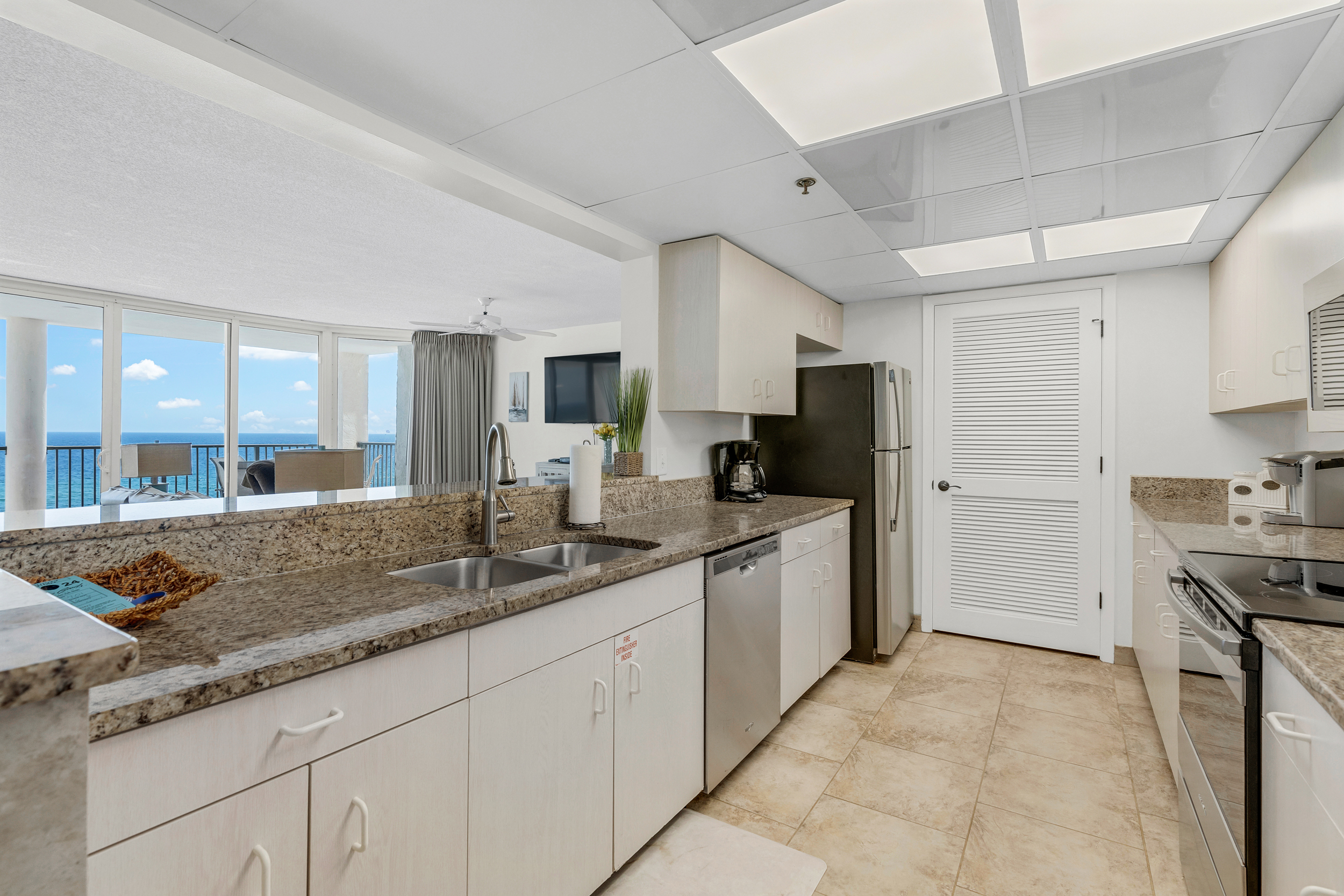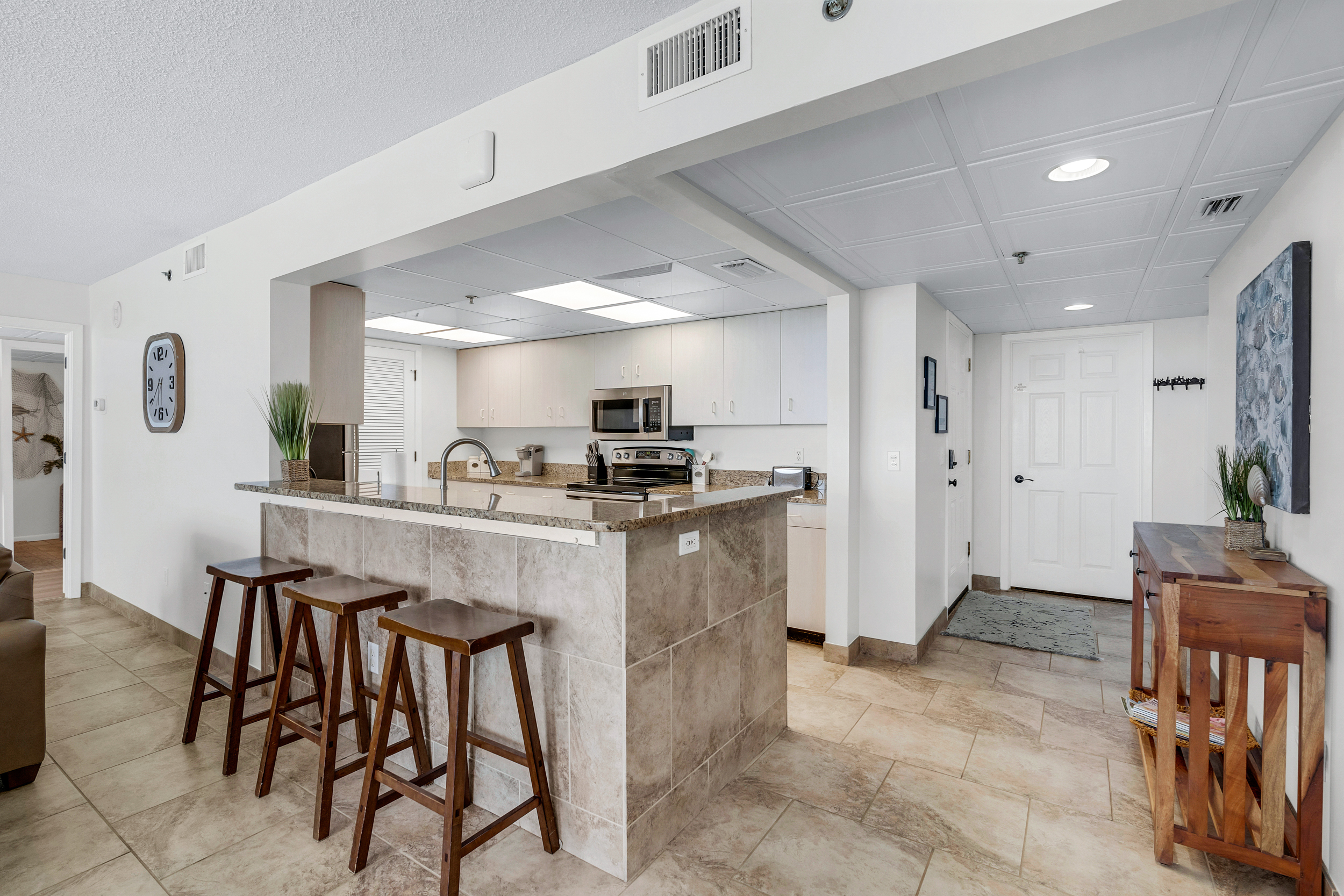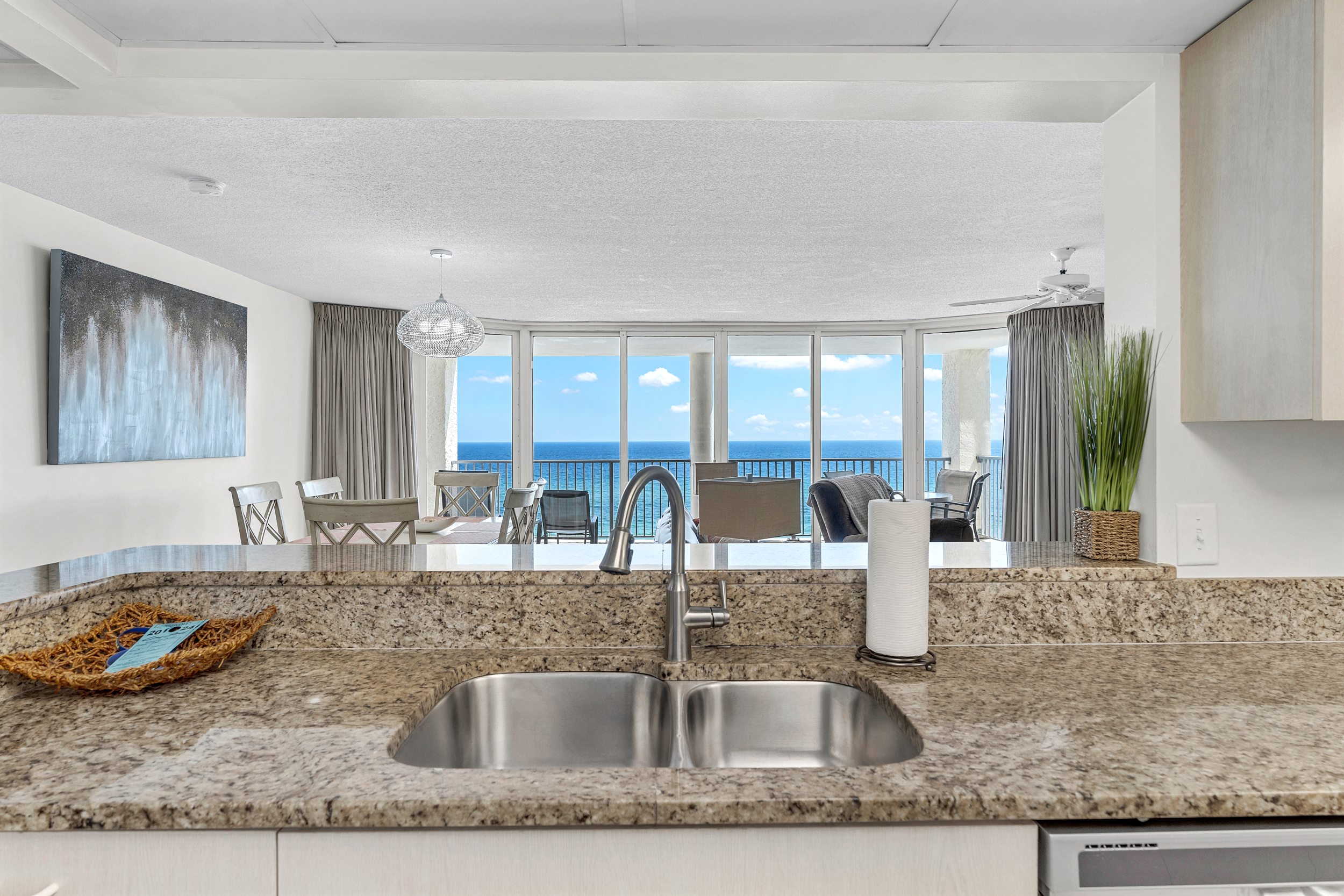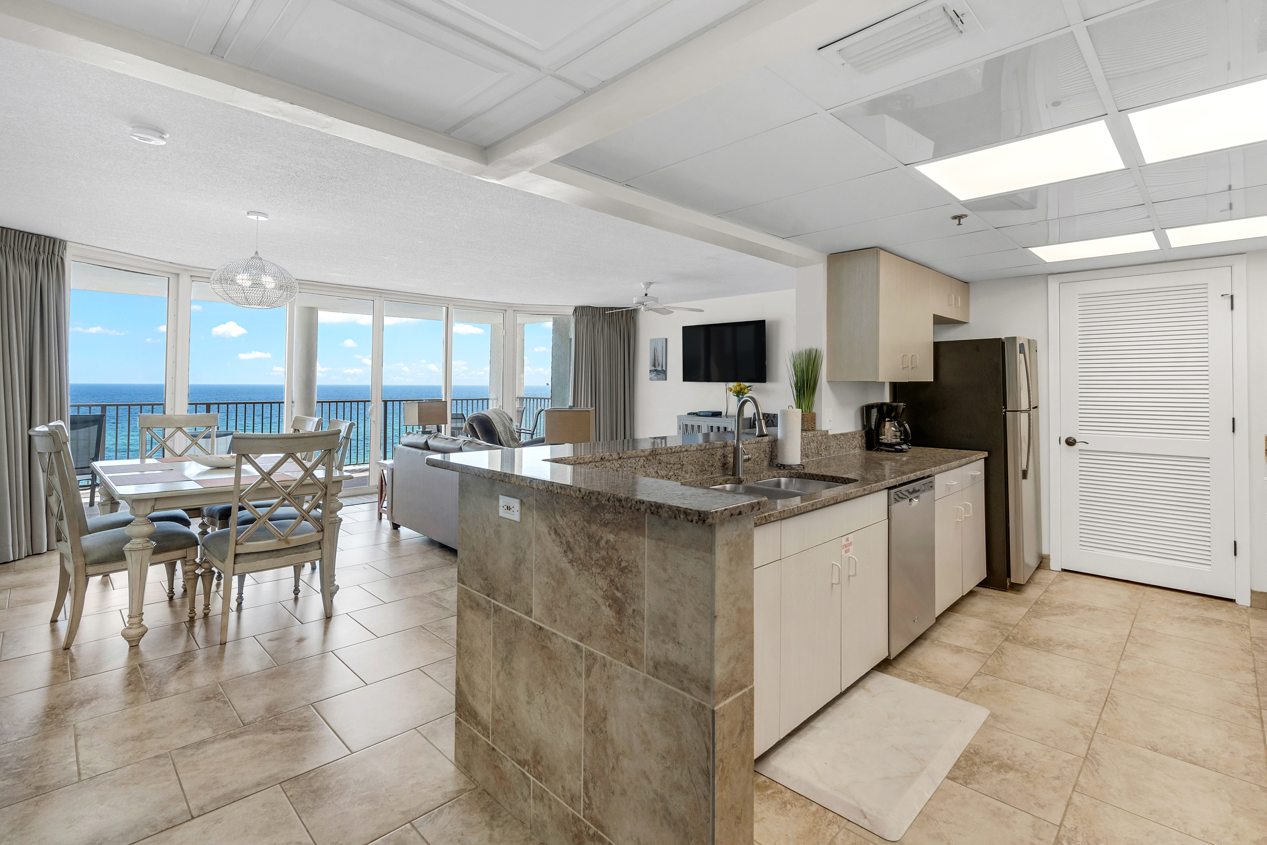 There is no better floorplan in all of PCB! This updated condominium offers nearly 1,800 square feet of coastal living space and a large balcony with new furniture to relax on and enjoy the sound of the waves. The kitchen features granite countertops, stainless-steel appliances, and is fully equipped with everything you need to prepare meals for family and friends. There is an indoor dining table as well as additional breakfast bar seating. The living room offers ample, comfortable seating with floor-to-ceiling views of the gulf, a flat screen television, and access to the unit's spacious private balcony. The first gulf front master bedroom is off of the living room with access to the main balcony. It offers a King bed, flat screen television, and its own ensuite bathroom. The bathroom was just updated to provide guests with a spacious walk in shower that includes dual shower heads. The second gulf front master suite off of the entryway offers a King bed, flat screen television, private ensuite bathroom, its own private corner balcony, and kitchenette. Make a cup of coffee and relax on your private balcony that was just updated with new furniture! The third gulf front bedroom offers guests 2 Queen beds, its own television, and a third full bathroom that was just updated to include a walk in shower with dual shower heads. The living room sofa pulls out into a Queen bed, allowing the unit to comfortably sleep 10. For your convenience, there is also a laundry room with washing machine and dryer located inside the unit for your use.