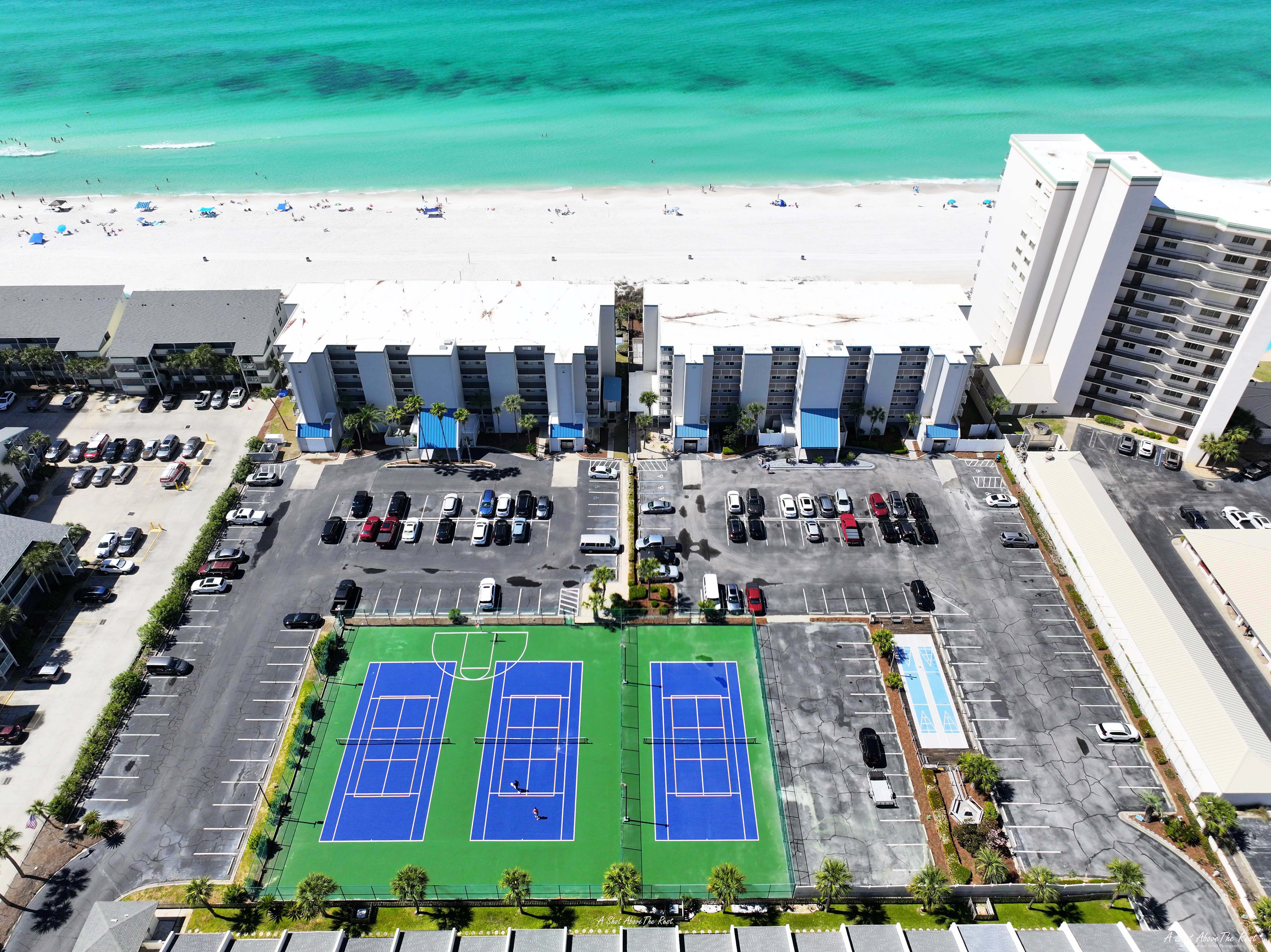 Mariner West is a small, quiet complex located on Thomas Drive on the east end of Panama City Beach. The building was recently renovated with all new windows, doors, exterior painting, and pool resurfacing. Mariner West offers guests a heated swimming pool, tennis/pickleball courts, shuffleboard courts, and an outdoor grilling area. It is within walking distance to several popular restaurants including Buster's Beer & Bait, Barracuda Beach Bar & Grill, & Outlaws BBQ and just a short 5-minute drive to both St. Andrew's State Park and pontoon boat rentals.