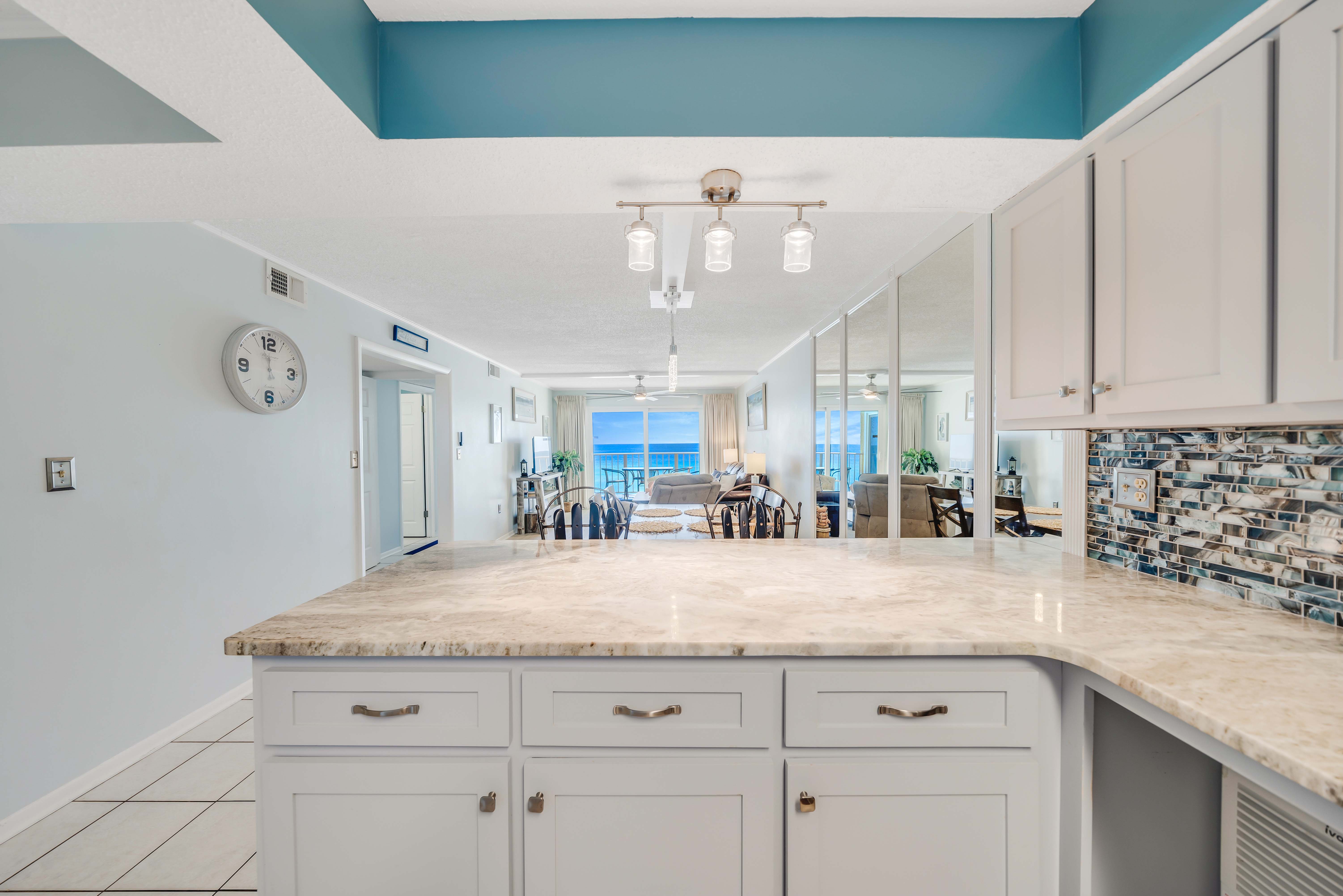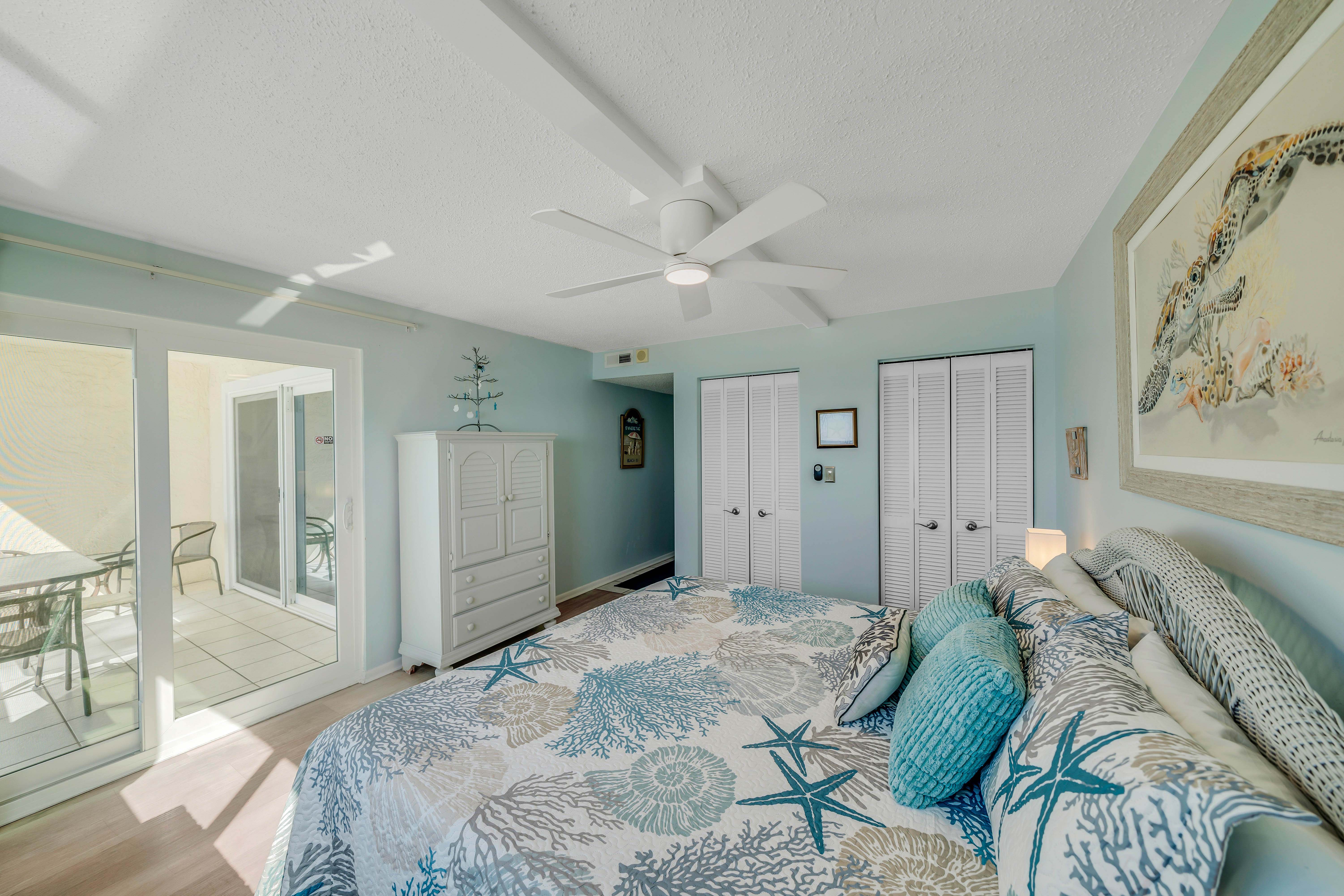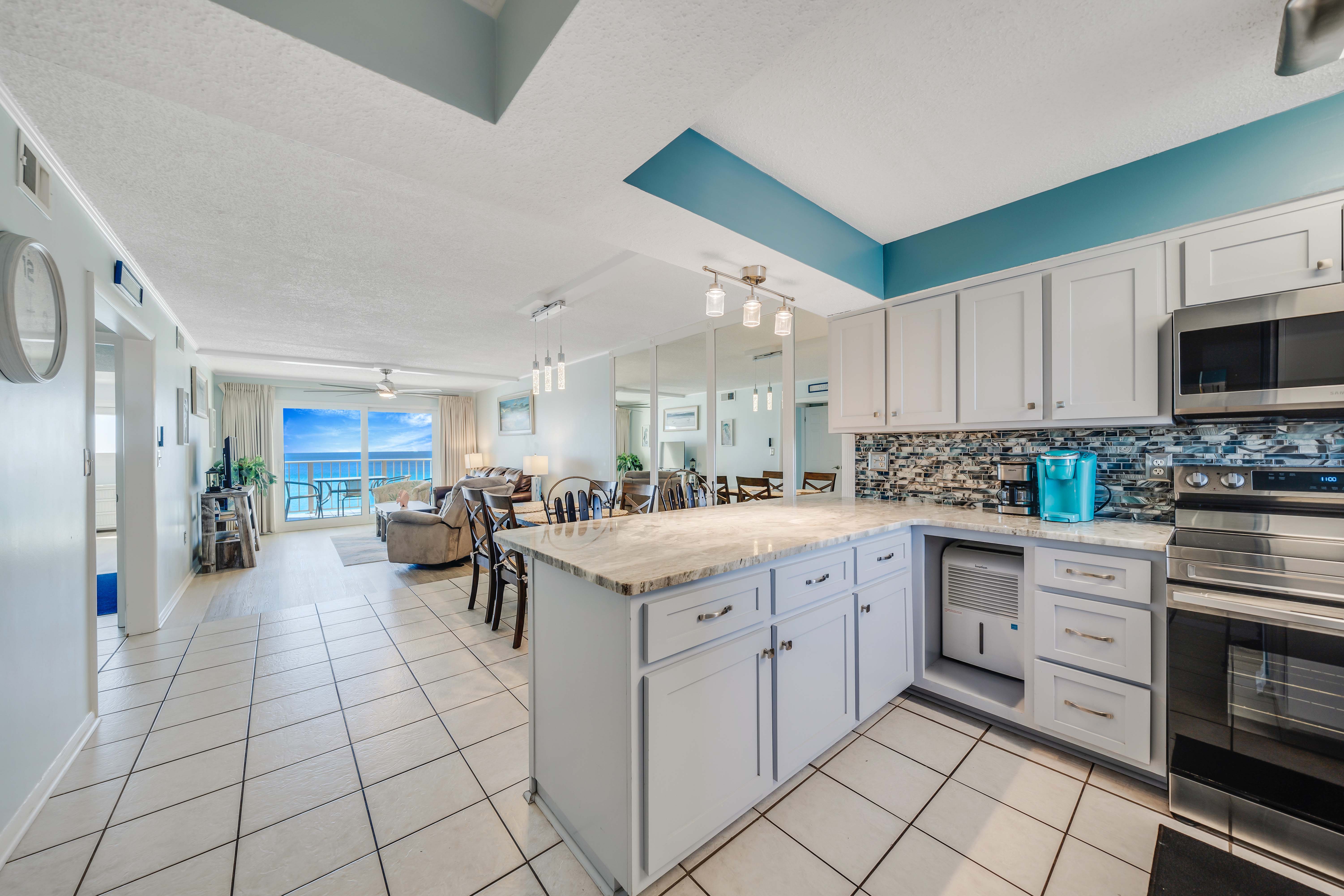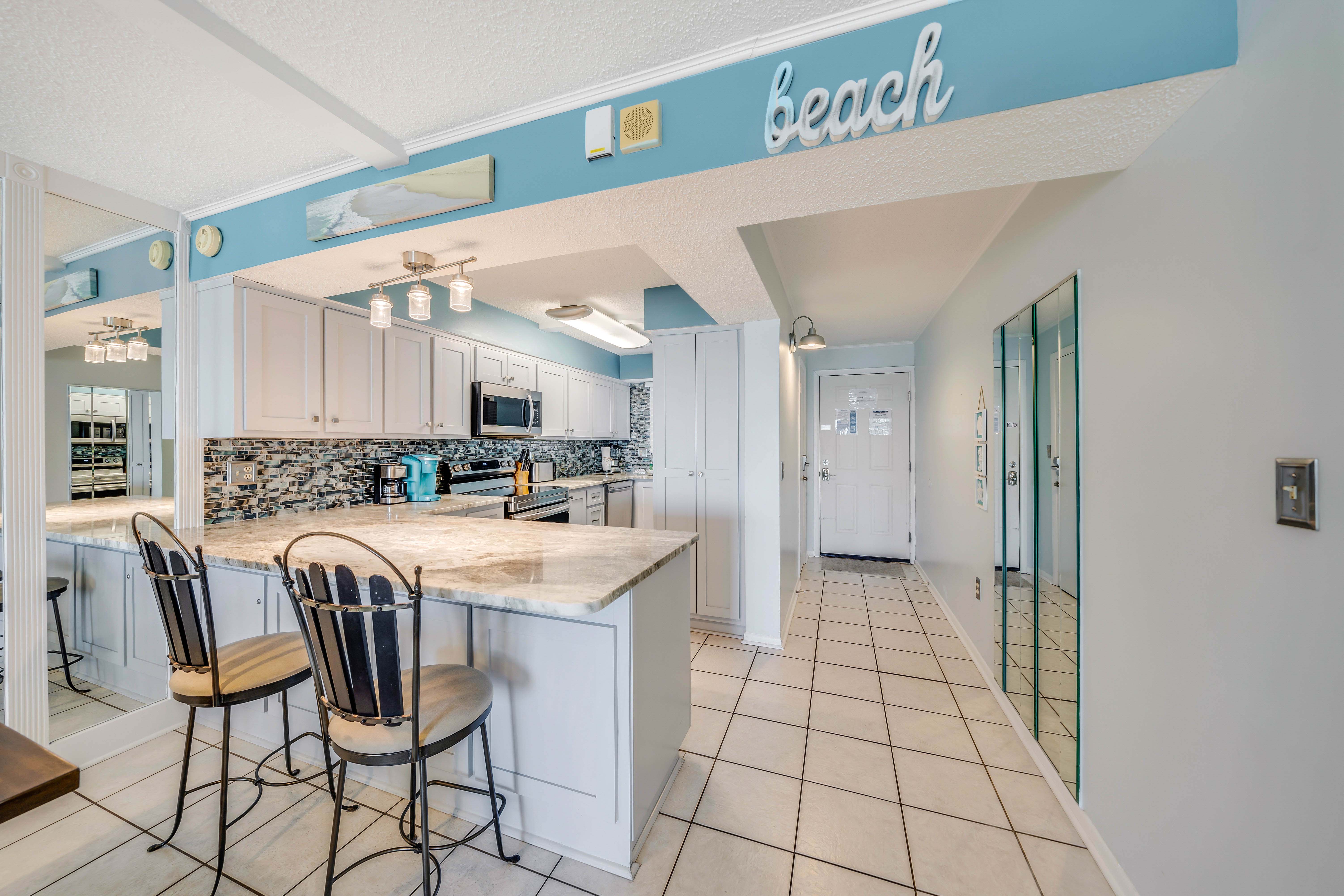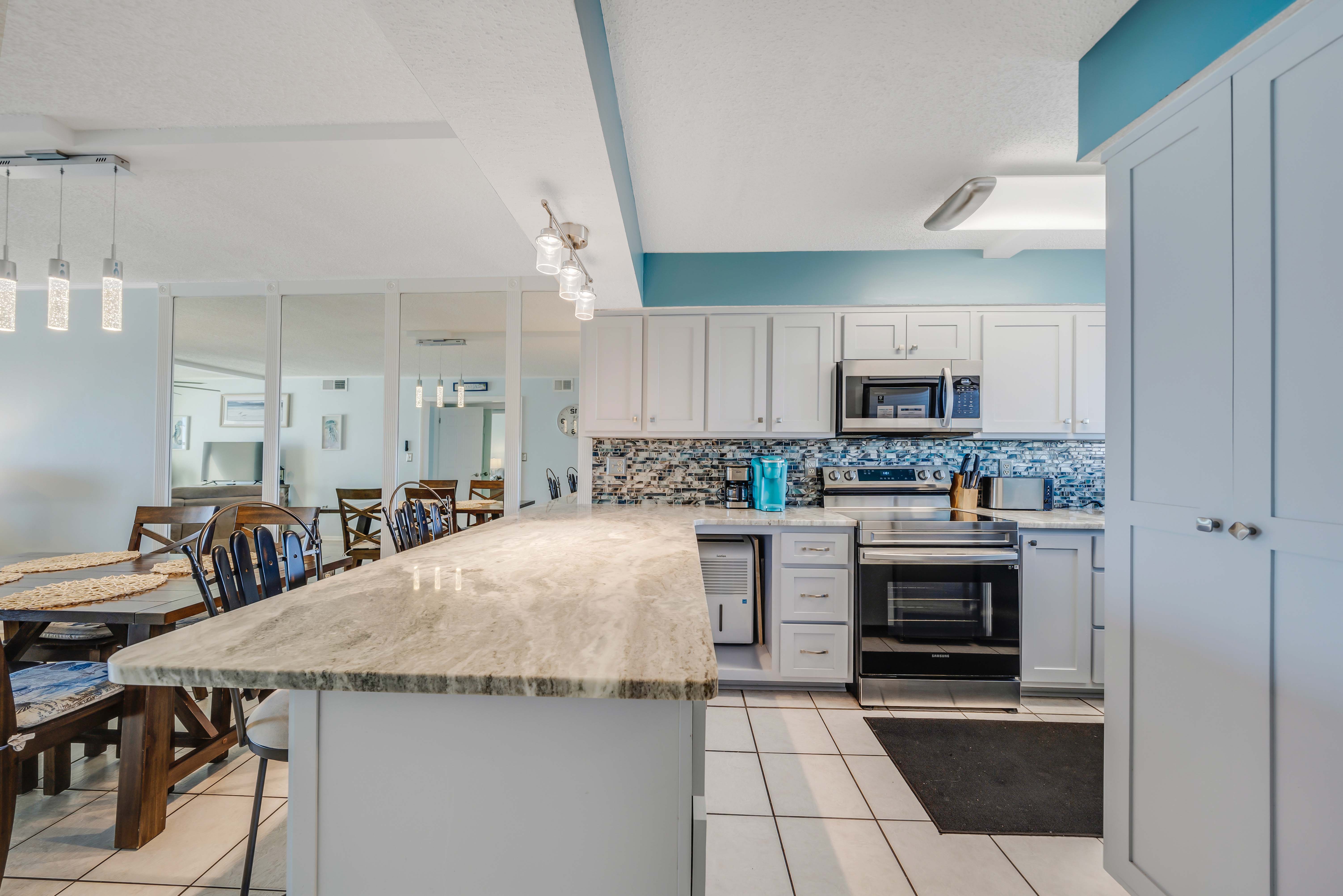 This spacious beachfront condominium unit offers almost 1,200 square feet of coastal living space. The fully equipped, updated kitchen features quartz countertops, stainless-steel appliances and has everything you need to prepare meals for family & friends. The living room and dining area offer ample, comfortable seating with incredible views of the gulf, a large television, and access to the unit's private balcony overlooking the beach. The master bedroom also has gulf views, a King-sized bed, television, and its own ensuite bathroom. The second bedroom has a both a Full and Queen-sized bed and its own television. There is a second full bathroom located off the hall. The living room sofa pulls out into a bed, allowing the unit to comfortably sleep 8. For your convenience, there is also a washing machine and dryer inside the unit for your use.