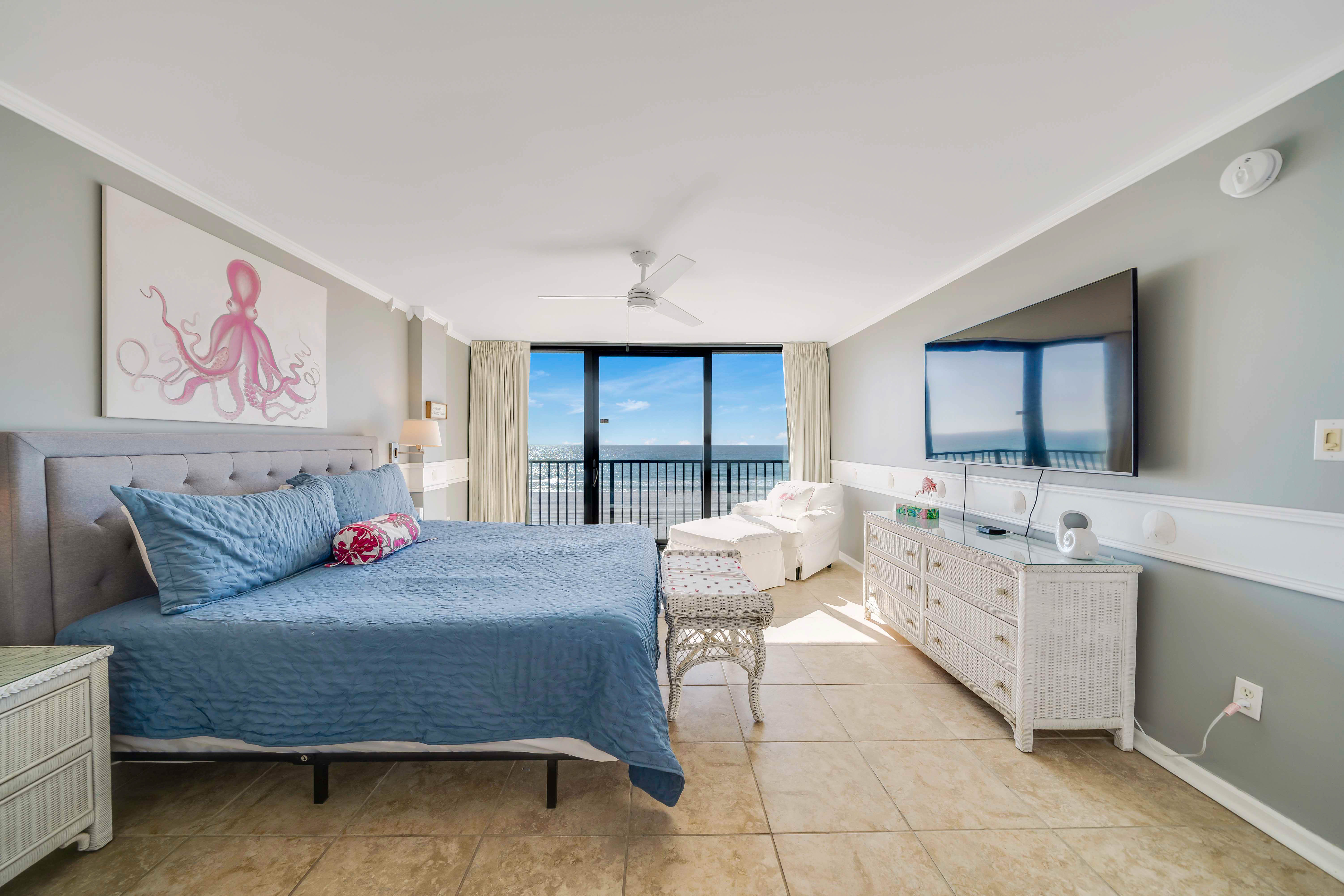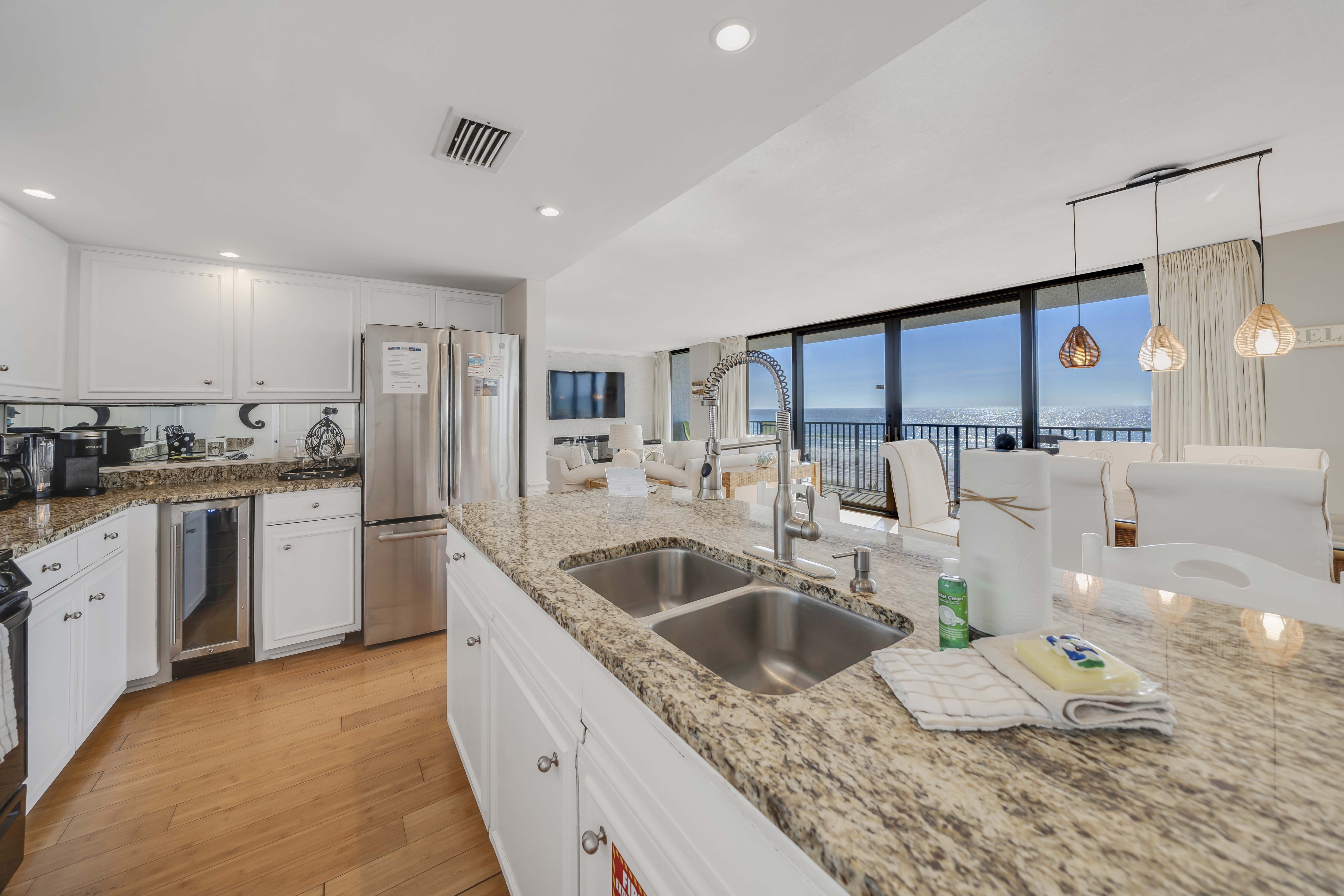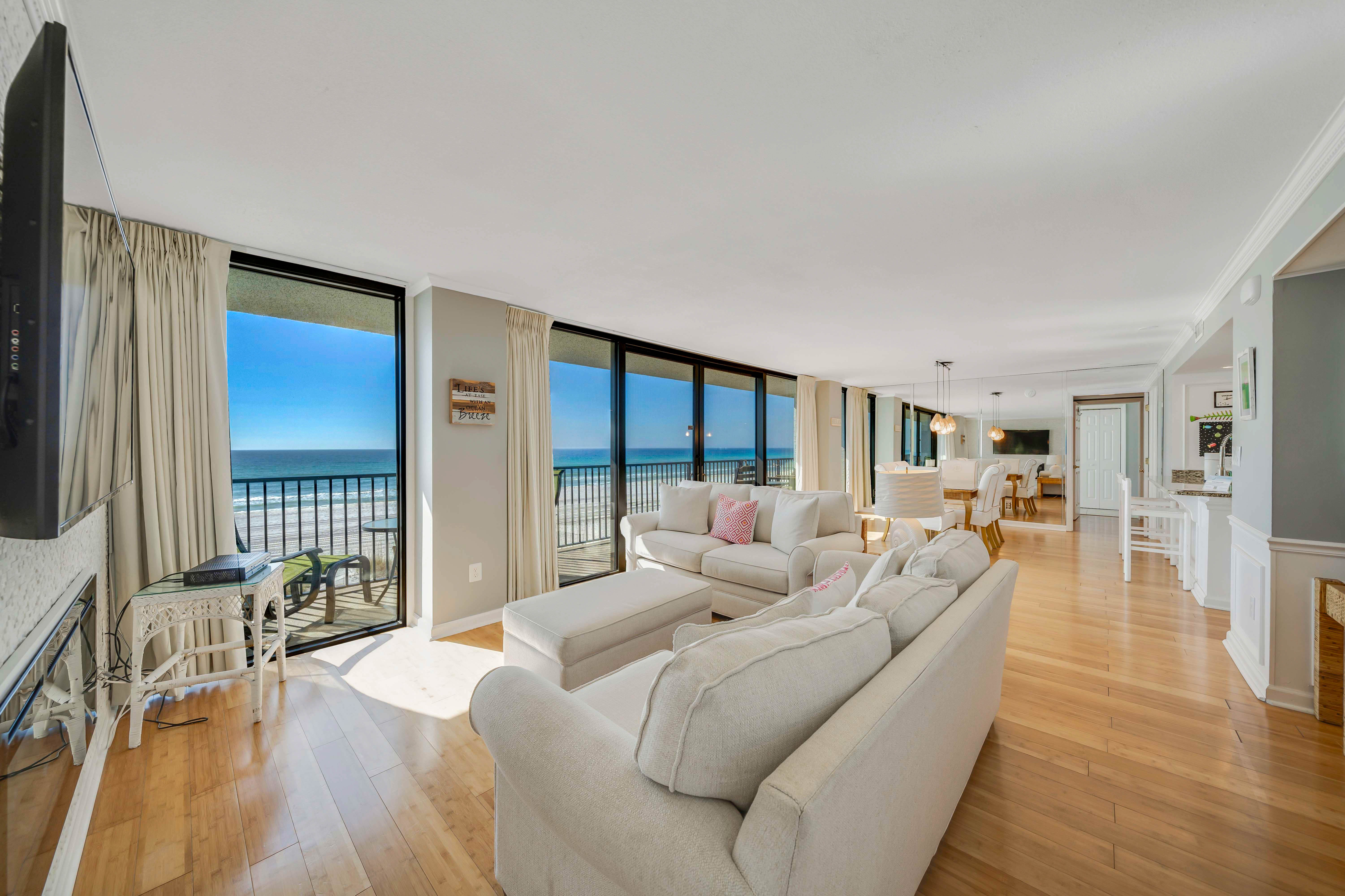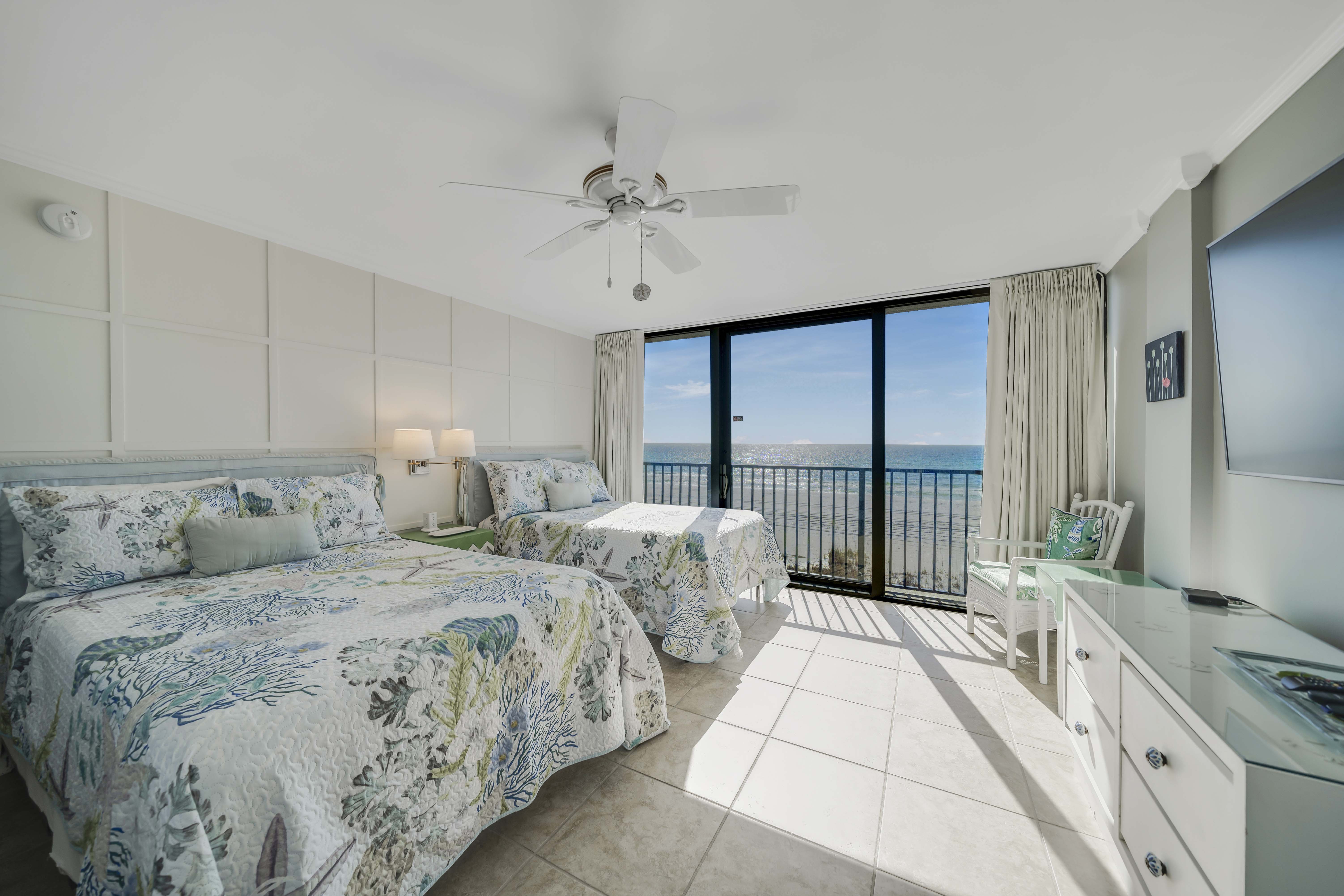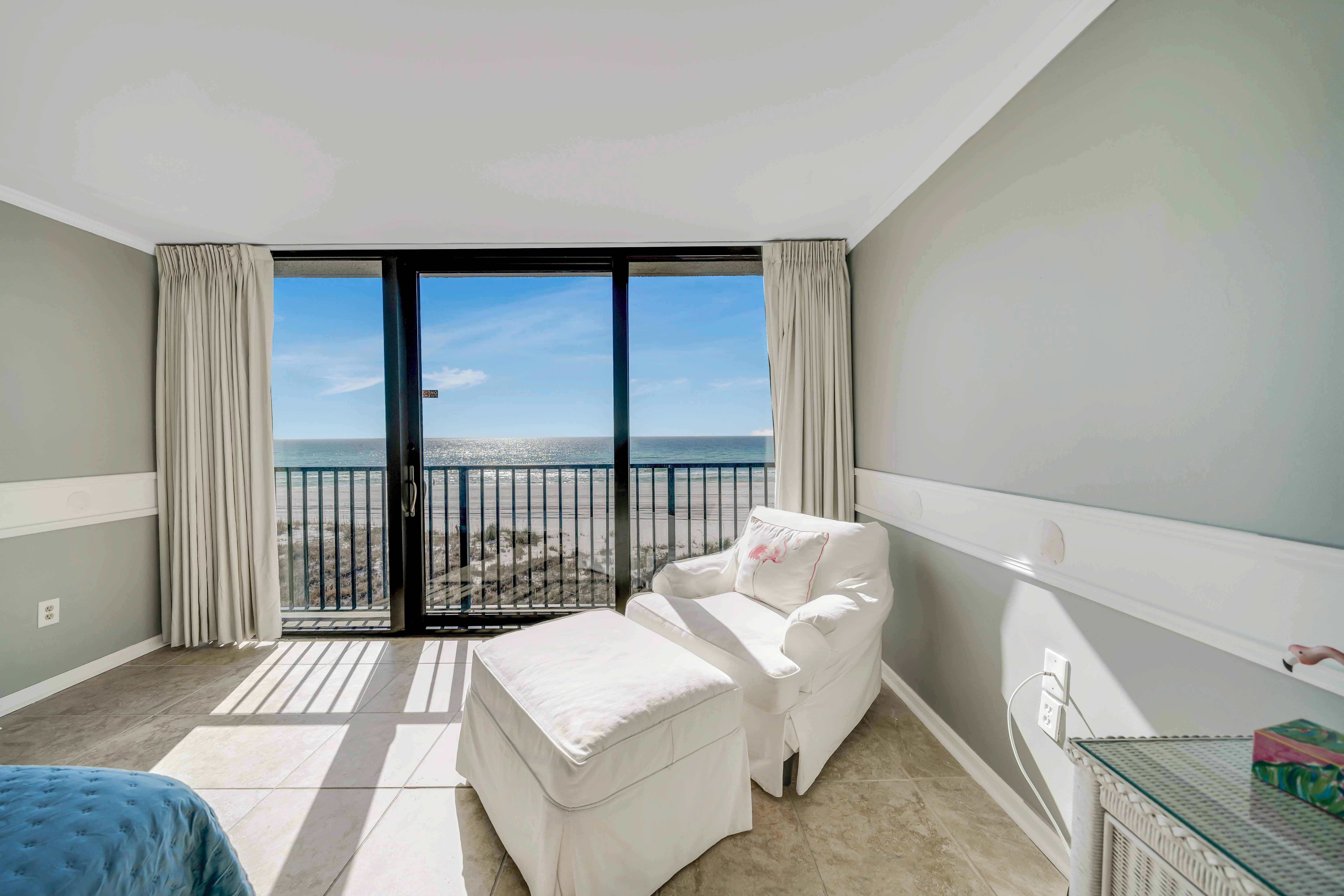 If you are looking for unobstructed views of the gulf from every room in your condo, this unit is for you! This lovely Seachase condominium boasts 1,400 square feet of living space with 2 gulf front master suites, one on each end of the unit. Each bedroom has its own full bathroom and spacious walk-in closet with a King bed in one bedroom and 2 Queen beds in the other. The living room features a pull-out sofa, allowing the unit to comfortably sleep 8. The generous sized, gulf front living/dining area and kitchen are located in the center of the unit. The fully equipped kitchen has a range oven, dishwasher, garbage disposal, refrigerator, microwave, and a full-sized washer and dryer. Every room has floor-to-ceiling windows, totaling 60 feet of wall-to-wall views of the gulf. This unit also features an electric fireplace in both the living room and master bedroom. Watch the beautiful sunsets while relaxing on your large, private balcony.
