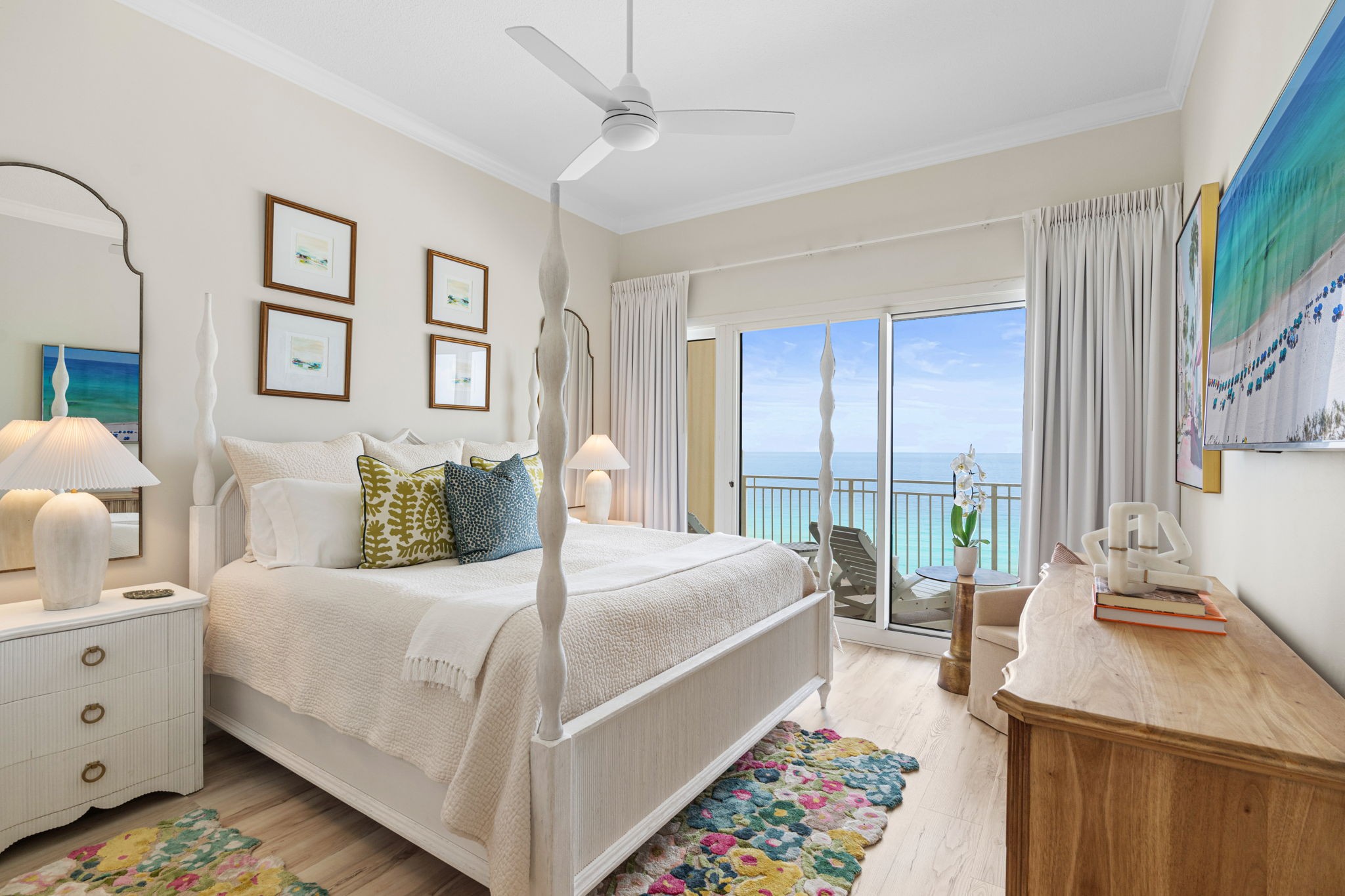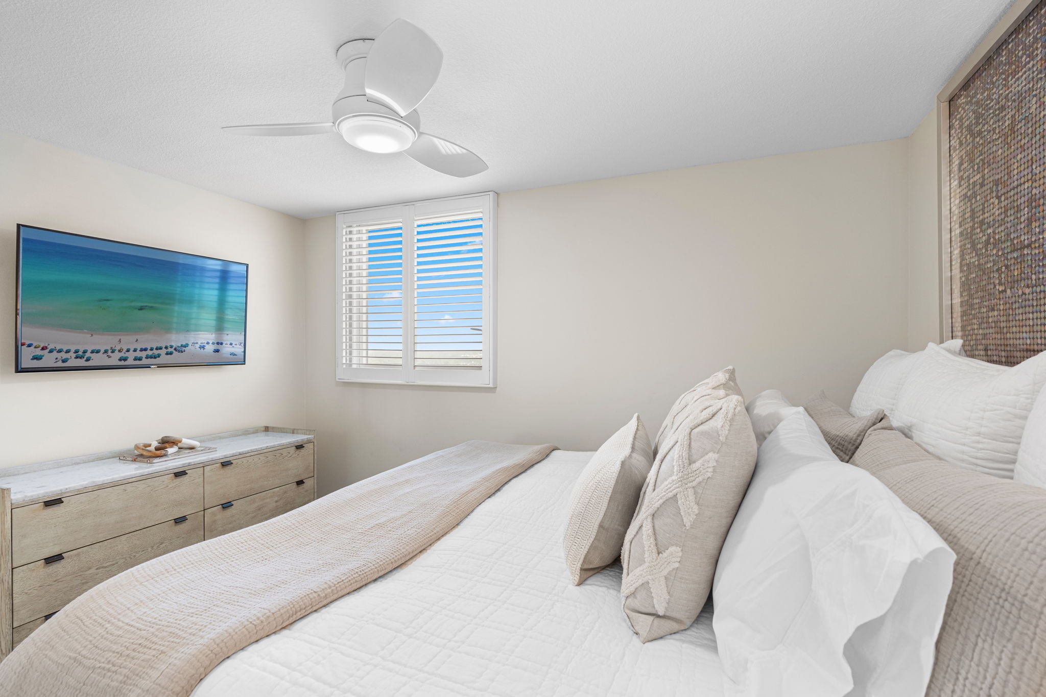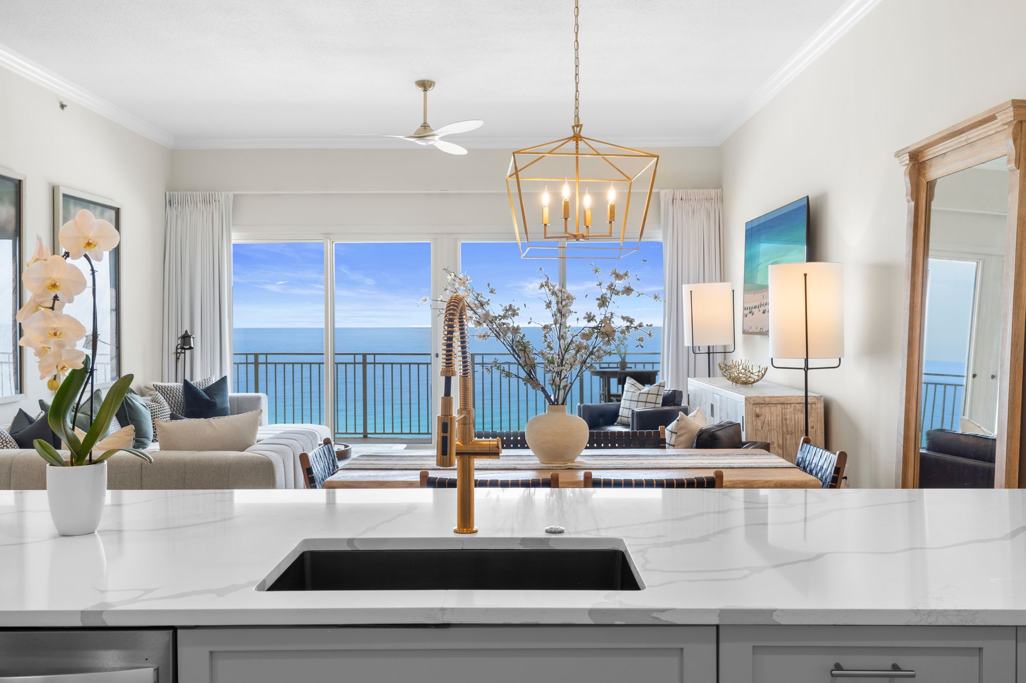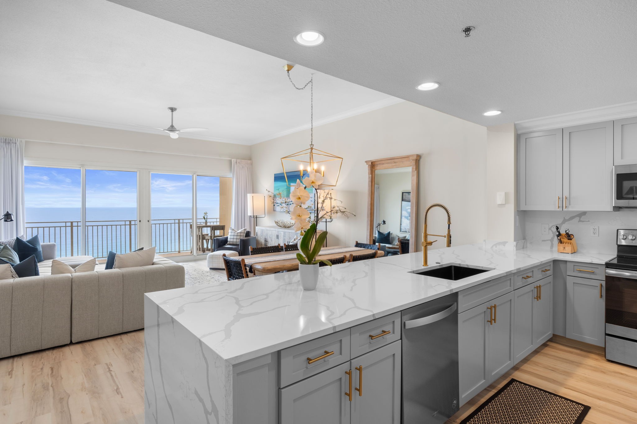 This spacious, recently updated unit offers over 1,600 square feet of luxury coastal living space. The fully equipped kitchen features beautiful quartz countertops, stainless-steel appliances, and has everything you need to prepare meals for family and friends. The living room offers ample, comfortable seating with expansive views of the gulf, a smart television, and access to the unit's private balcony where you can dine or enjoy a cocktail overlooking the beach. There is a dining table, perfect for enjoying a meal or playing a game, as well as additional breakfast bar seating. The gulf front master bedroom also boasts breathtaking gulf views, a King size bed, and ensuite bathroom featuring double sinks, a spacious walk-in shower, and a large soaking tub. The second bedroom also offers another King bed, while the third bedroom has two twin beds. All bedrooms have their own televisions. The second full bathroom has another spacious walk-in shower. For your convenience, there is a full-sized washing machine and dryer located inside the unit for your use.