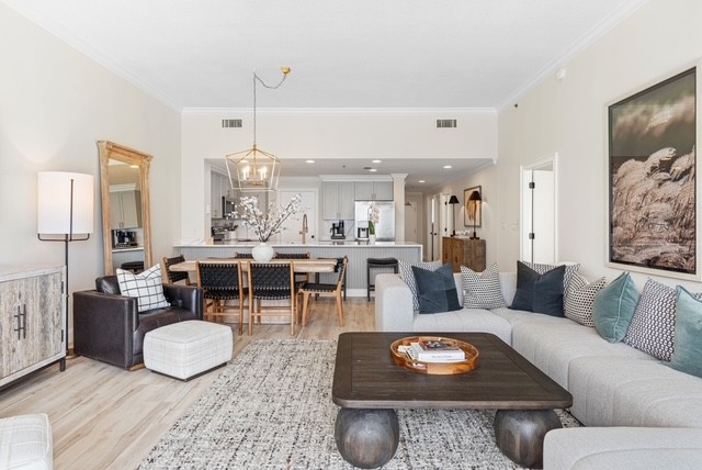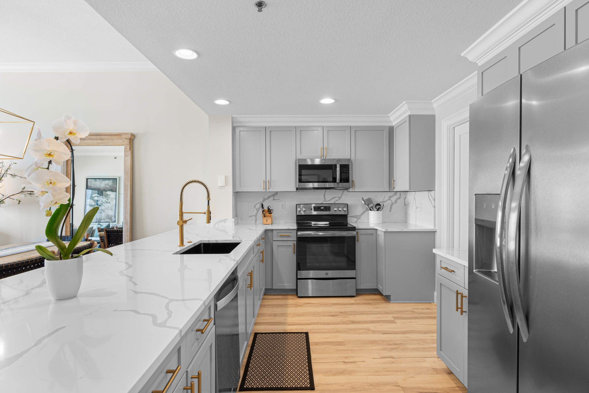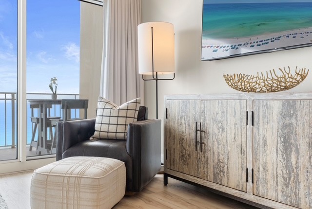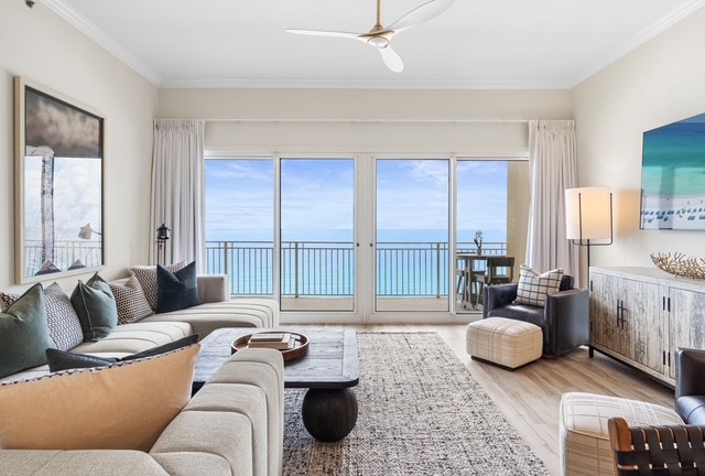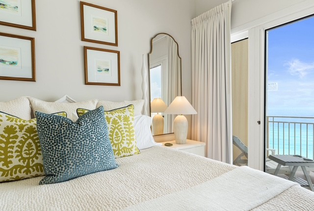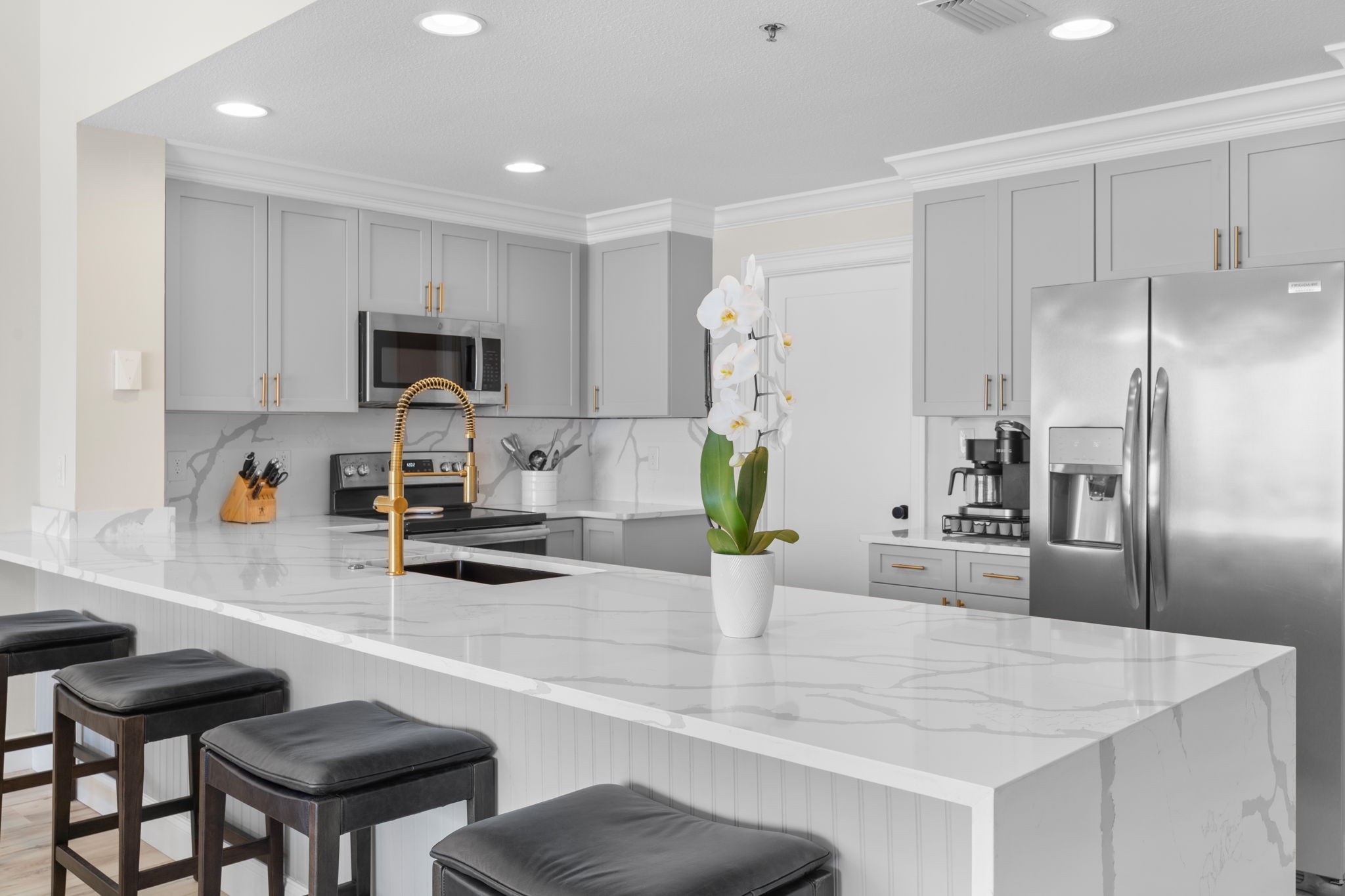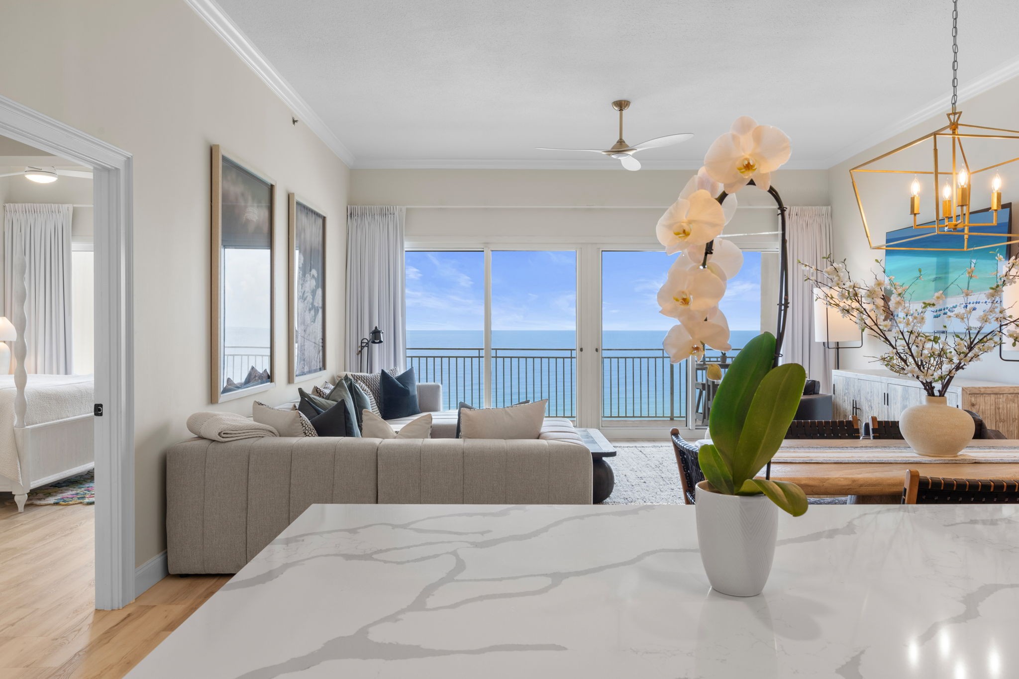 This spacious, recently updated unit offers over 1,600 square feet of luxury coastal living space. The fully equipped kitchen features beautiful quartz countertops, stainless-steel appliances, and has everything you need to prepare meals for family and friends. The living room offers ample, comfortable seating with expansive views of the gulf, a smart television, and access to the unit's private balcony where you can dine or enjoy a cocktail overlooking the beach. There is a dining table, perfect for enjoying a meal or playing a game, as well as additional breakfast bar seating. The gulf front master bedroom also boasts breathtaking gulf views, a King size bed, and ensuite bathroom featuring double sinks, a spacious walk-in shower, and a large soaking tub. The second bedroom also offers another King bed, while the third bedroom has two twin beds. All bedrooms have their own televisions. The second full bathroom has another spacious walk-in shower. For your convenience, there is a full-sized washing machine and dryer located inside the unit for your use.